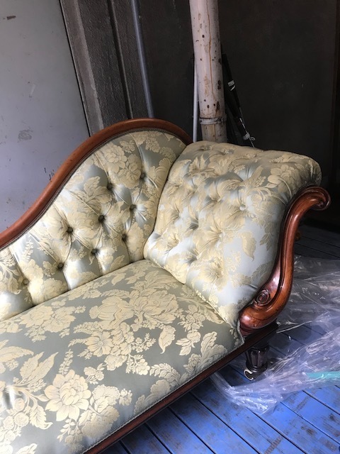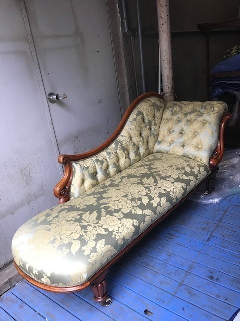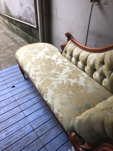 素敵な英国アンティークのカウチソファです。きれいにお使いのソファですが、座面のへこみで座り心地良くないので張り替えて内部を全部交換することになりました。
