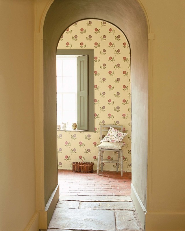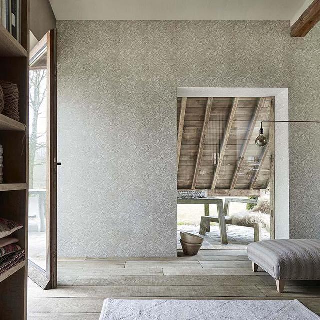 ウイリアム・モリスの次女メイ・モリスによる刺繍の連作からインスピレーションを受けた壁紙。彼女の季節を題材にしたデザインをもとに、インコ、ローズ、チューリップ、茎、葉や花々を表現しています。