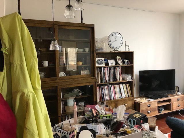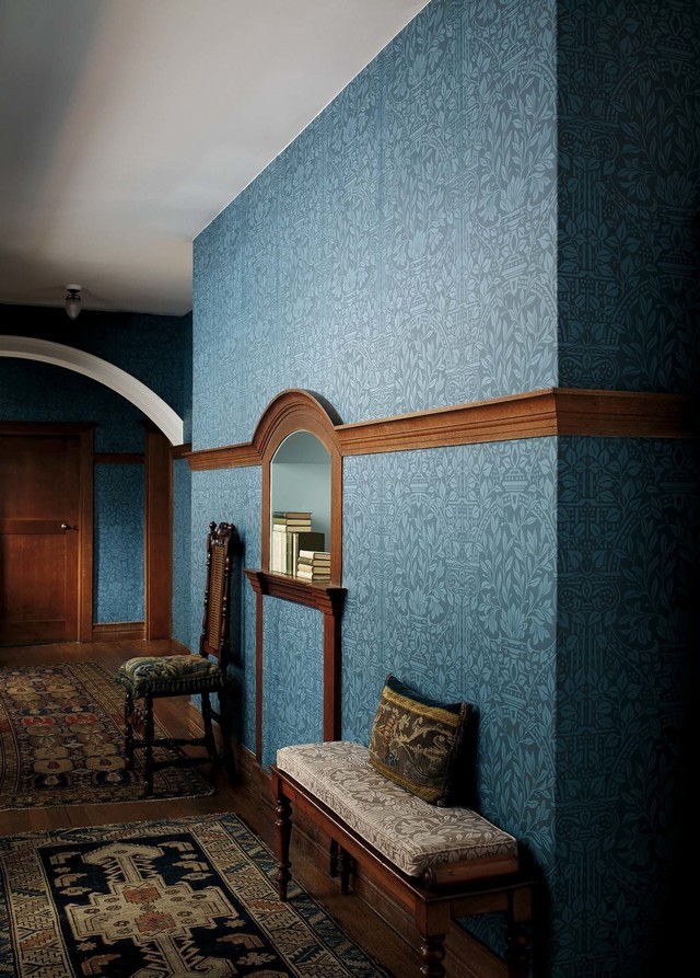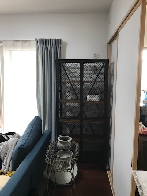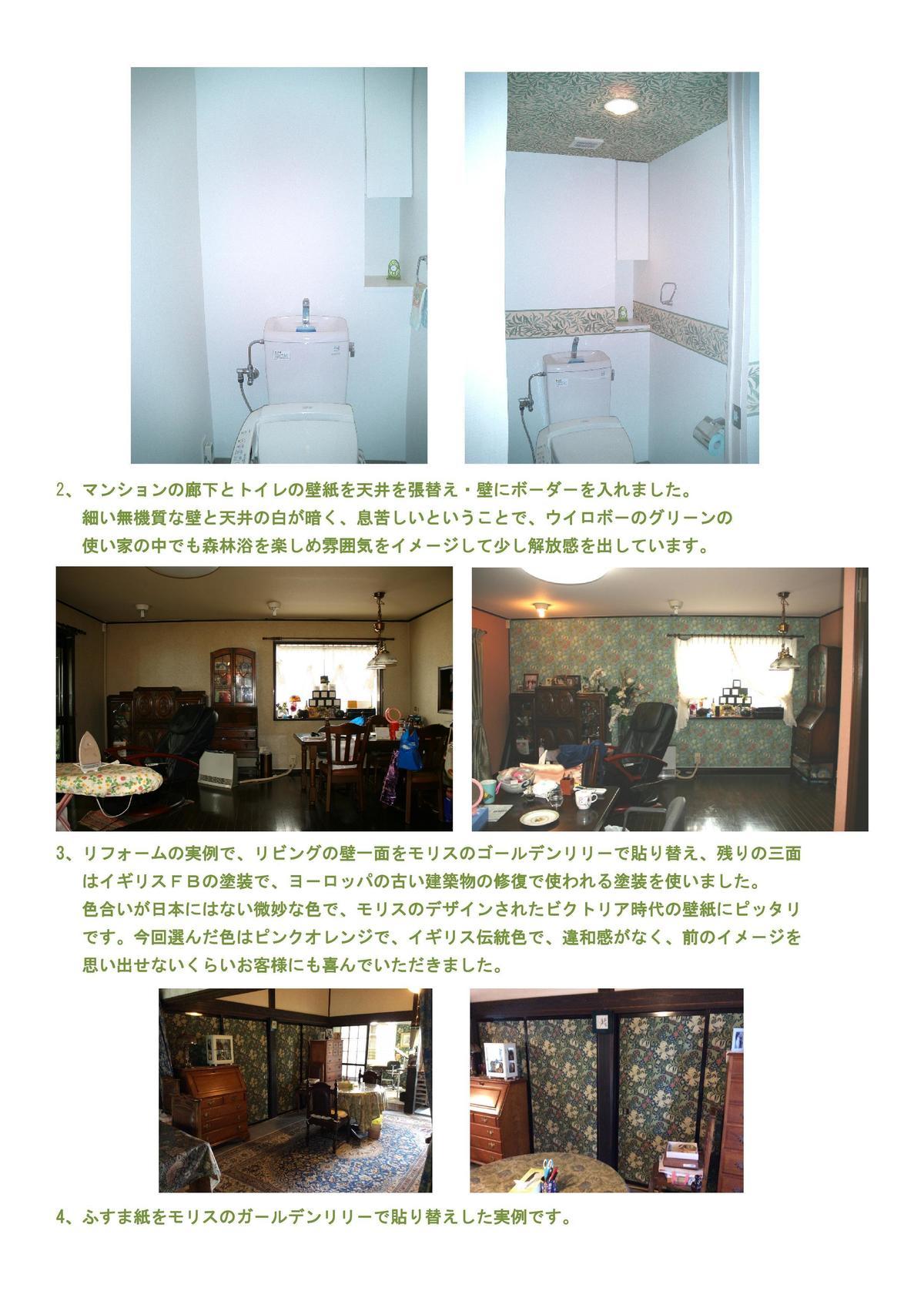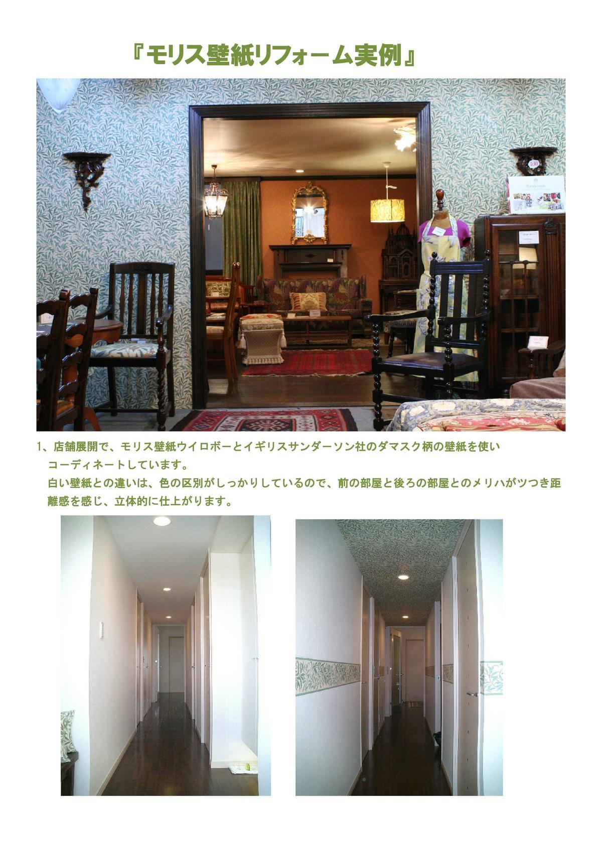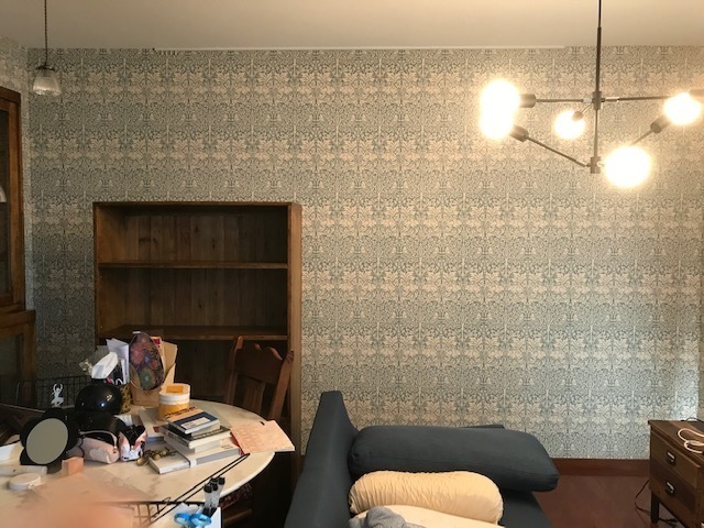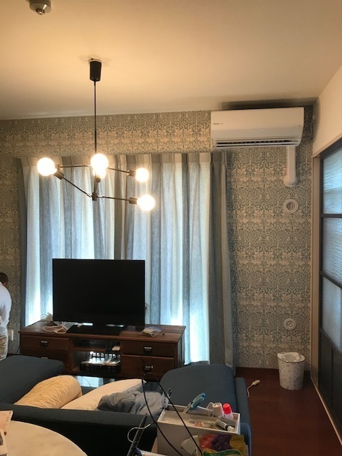 リビングの壁紙をウイリアム・モリスのブレアラビット(ブル-)で南側と東側の壁に貼り替えしました。西側が和室のガラス扉を特注で大正浪漫の雰囲気で作りましたので、壁紙のブル-とガラス扉の焦げ茶のフレ-ムがブル-と茶色の組み合わせで素敵な空間になりました。