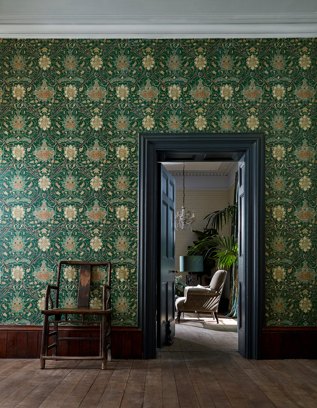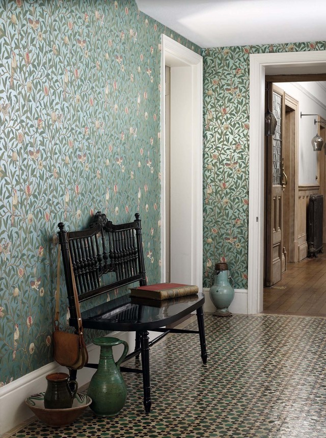 和室の部屋にウイリアム・モリスの次女メイ・モリスのデザインした生地で