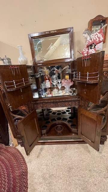 アンティークキャビネット素晴らしいデザインのバーキャビネットです。状態も良く普通に使いこなせます。サービスカウンターも付いてるので、カクテルを作るのにも充分なスペースが取れます。昨日展示しましたので、ご興味がある方はお早めにご覧ください。