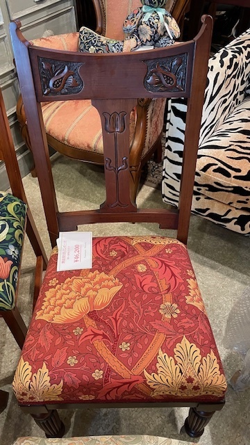 アンティーク家具とウイリアム・モリスの世界を楽しんでいただける部屋を2階に作りました。実際にイスやソファを張り替えた商品を身近に感じてもらえるように英国アンティークのイスや現代家具にもモリスのデザインがどのように取り入れ私たちの暮らしに溶け込めるかを見てほしいです。カーテン・椅子張り・クッション・テーブルクロス・ランチョンマット・ベッドスプレット・ランプシェード・ひざ掛け・タペストリー・カーテンなどお好きな生地でお作りすることが出来ます。