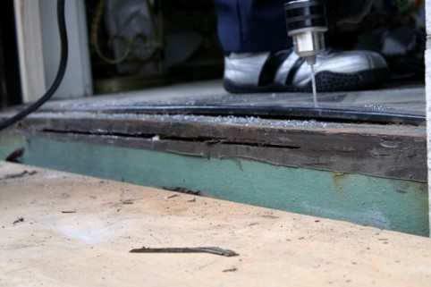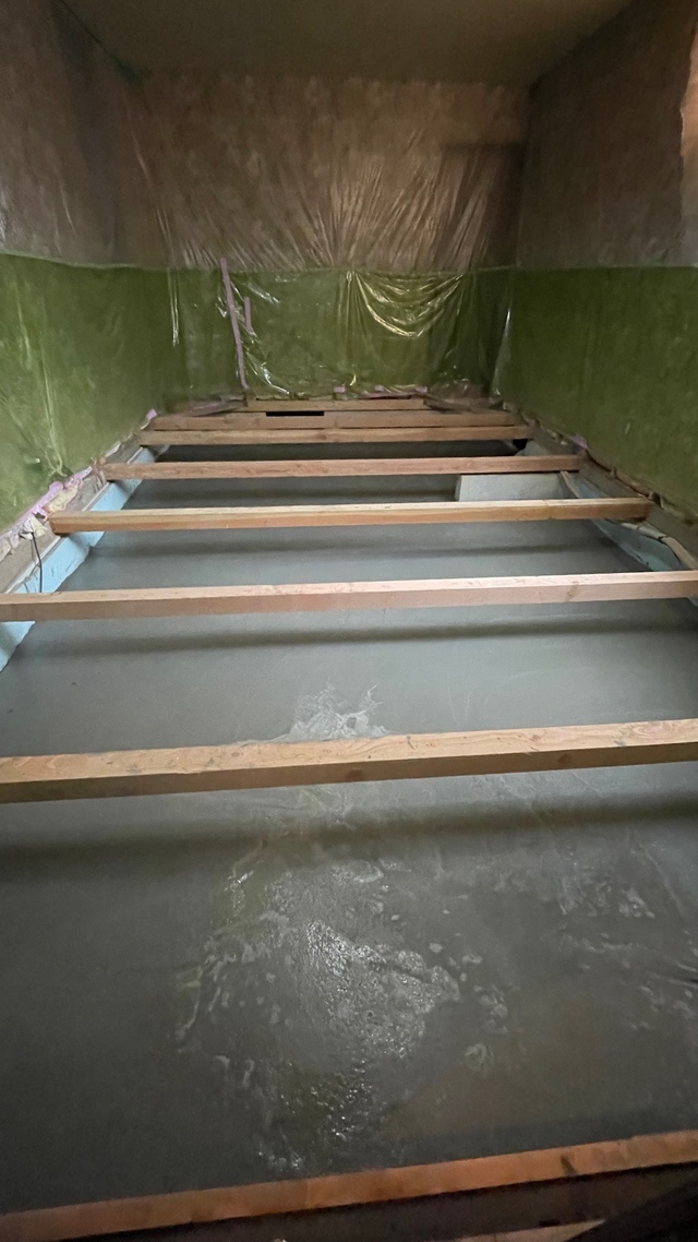 メンテナンスフリーの電気式床暖房を取り入れました。床の骨組みを全部取り外して、基礎の部分にコンクリートを流し込み湿気や寒さが床に伝わらないようにしています。骨組みを作り直し、床の下地を作りその上に床暖房のシートを乗せて床材を貼り替えています。