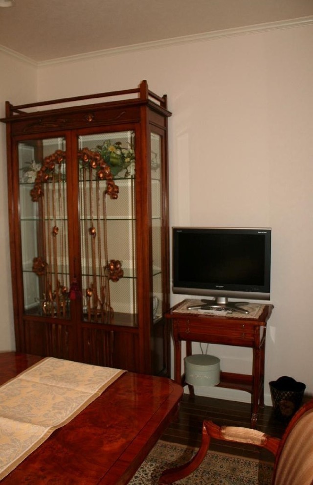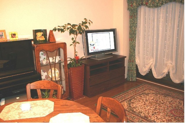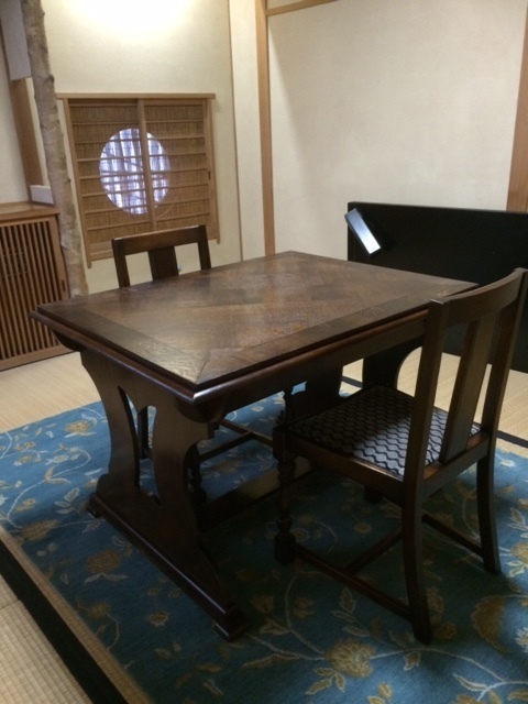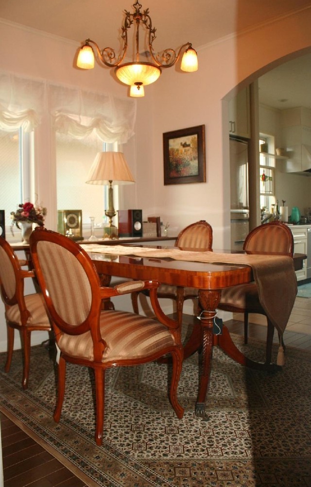 今までお使いの照明器具やインテリア小物とダイニングセットのバランスがよくまとまりお客さんに喜んでいただきました。イタリア製カップボードが引き立ち伝統工芸のアールヌーボーデザインがピッタリで、液晶テレビもコンソールテーブルの高さがイスに腰掛けた時に丁度良かったようです。