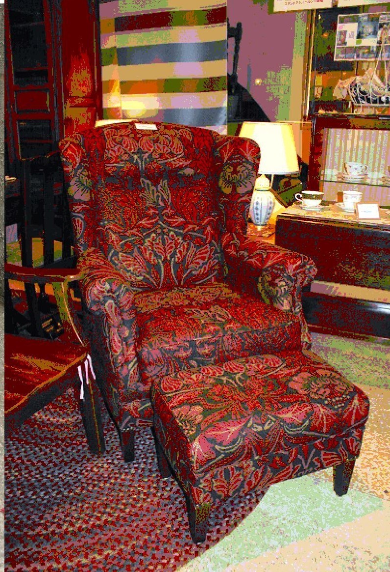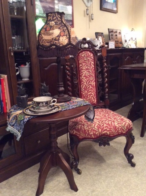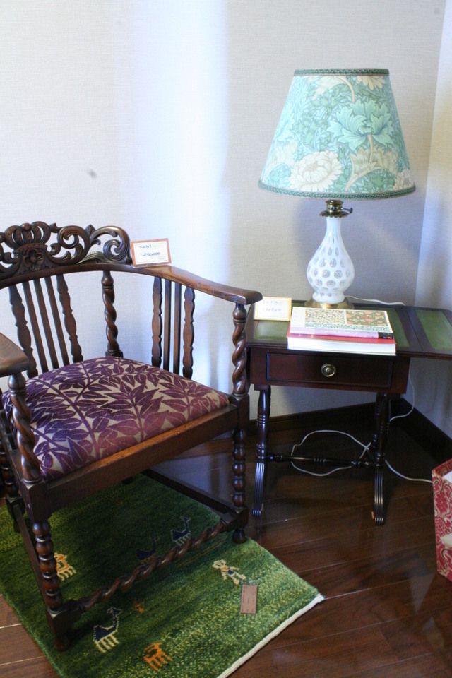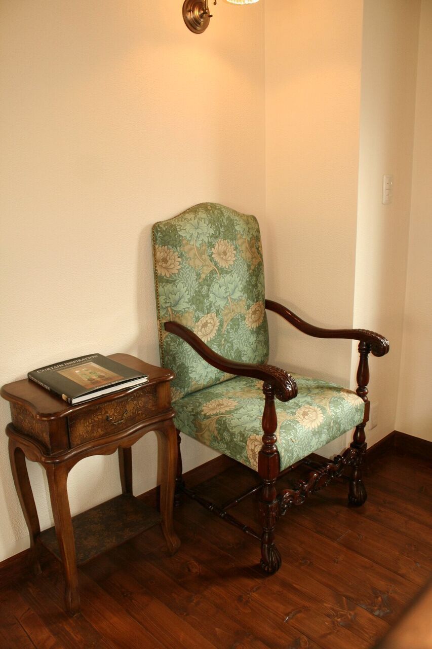 お部屋の隅に自分だけが楽しめるコーナーがあるのはどうでしょうか。お気に入りのチェアに座り一杯のお茶を楽しむ時間は豊かな気持ちにさせてくれるひと時だと思います。こちらのチェアは、英国アンティークの100年前のものです。座る座面が普通のものより低いチェアでナーシングチェアとも言われてますが、その当時アフタヌーンティーを楽しむチェアです。コーヒーテーブルにテーブルランプを置き満足できるインテリアをお楽しみください。