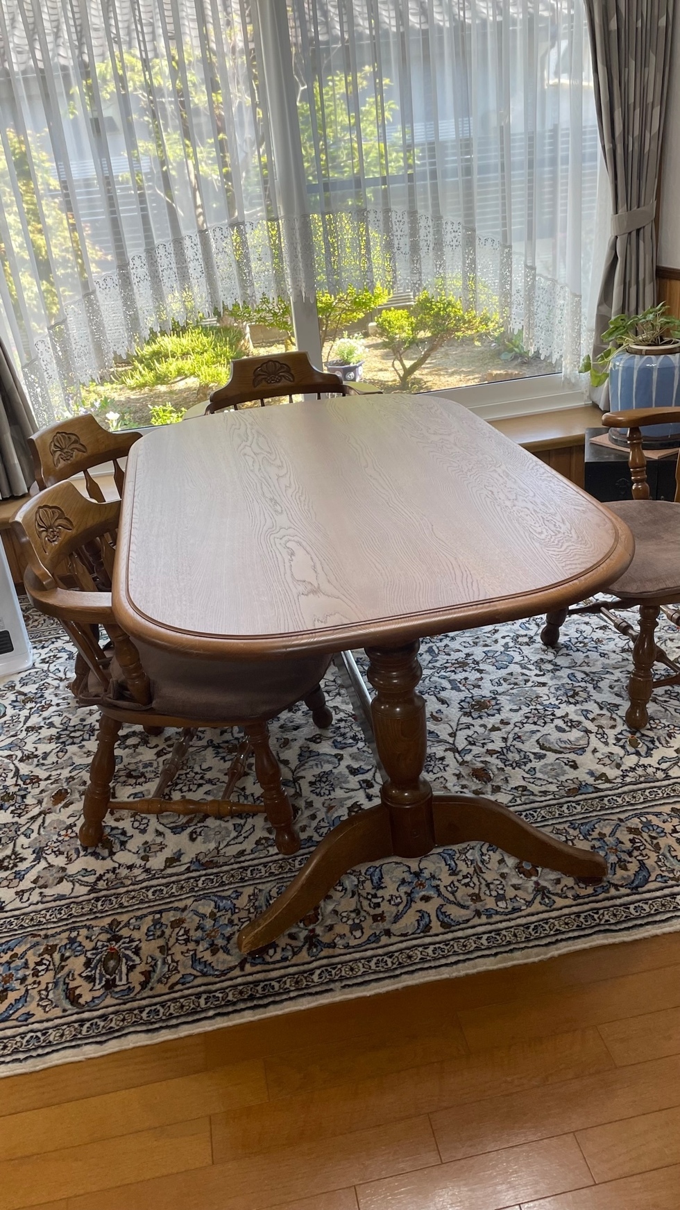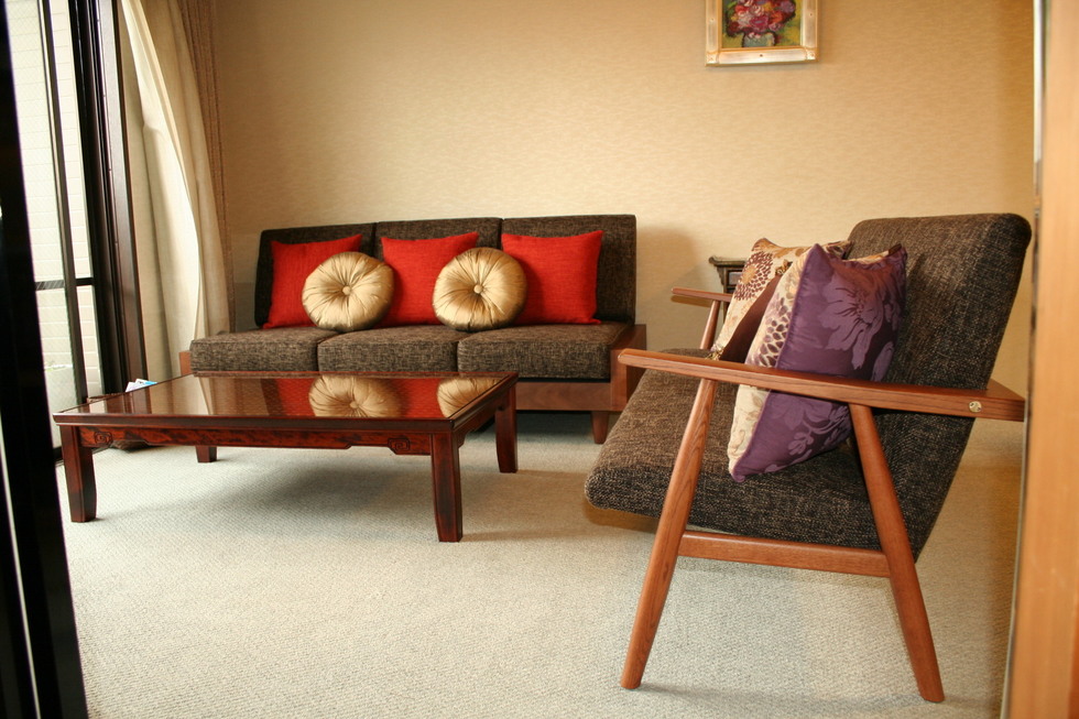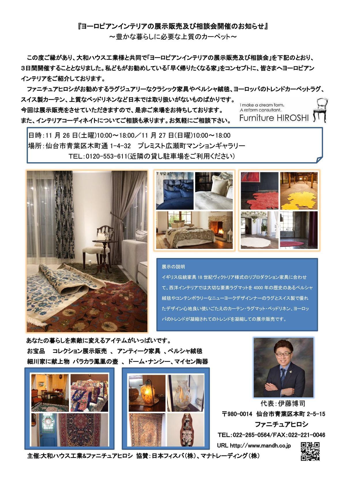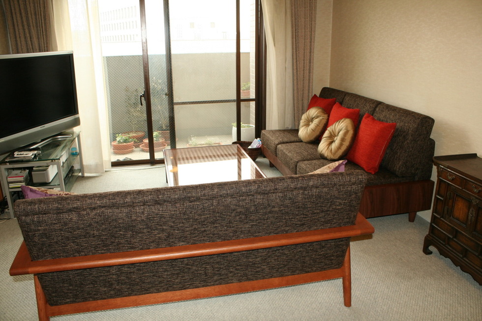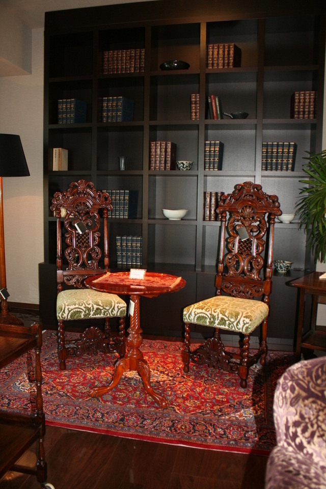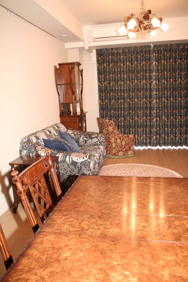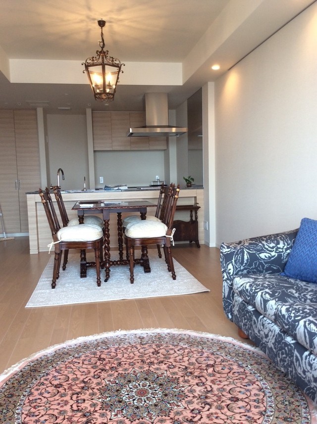 家具・照明器具・絨毯などを納めさせていただいています。5月のペルシャ絨毯展での円形の絨毯がきれいでやさしい雰囲気になりました。ソファは素早くベットにもなります。座面を毛前に引き出すとチャスターついたクッションが出てきてダブルベットに早変わりします。アール・ヌーボーデザインのキャビネットもオブジェのようなオシャレなデザインです。ダイニングセットはイギリスビクトリアデザインの現代物でマホガニーのワインレッドとアイボリーのクッションが無機質のマンションにピッタリです。照明器具はランタン型のやさしい明かりが天井にも広がります。これからソファ用のテーブルに特注で作るブランケットチェストと特注タペストリが出来上がれば形になると思います。