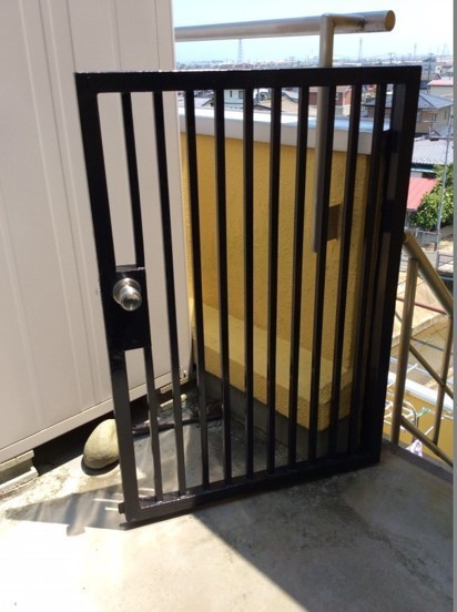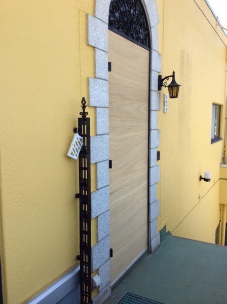 玄関ドアの穴が開いた部分で、ドアを外し板を当てて塞いでます。