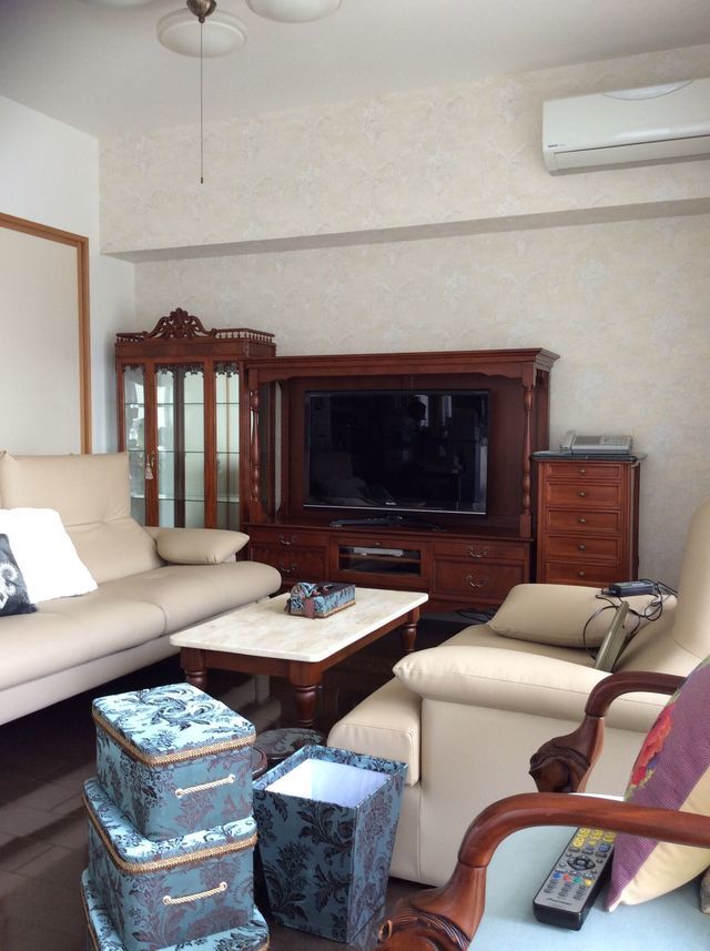 壁面収納家具が作り付けで壁一面にありましたが家具をガラスキャビネットやTVボードに変えて壁紙をアメリカ製のもので貼り替えました。