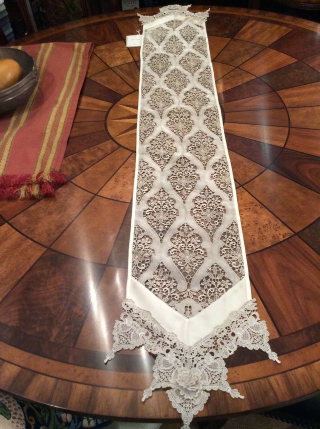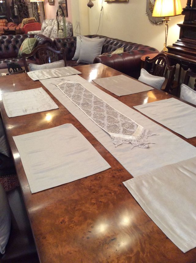 テーブルセンターには繊細な刺繍で出来たクロスを装飾として中心に組み合わせて華やかさをプラスしてのご提案です。ダイニングテーブルと合わせてソファにクッションを一緒にコーディネートしました。