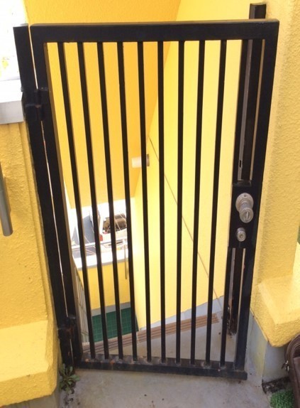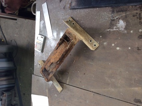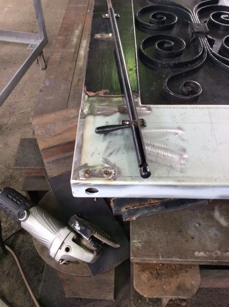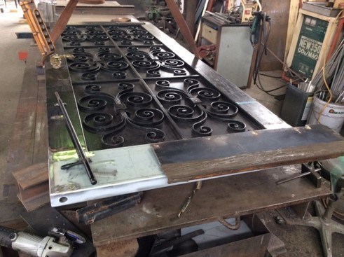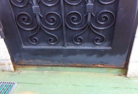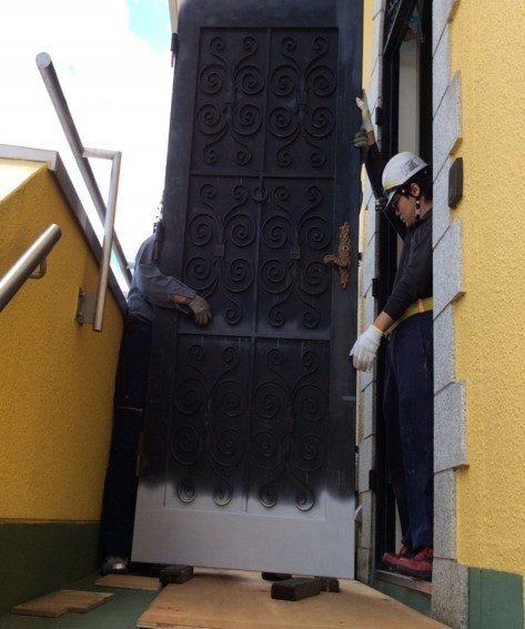 鉄の玄関ドア(重さ300Kg)や門扉や勝手ドアのリフォームです。水が内部に入り錆で下部に穴が開きクレーンを使い下ろしました。