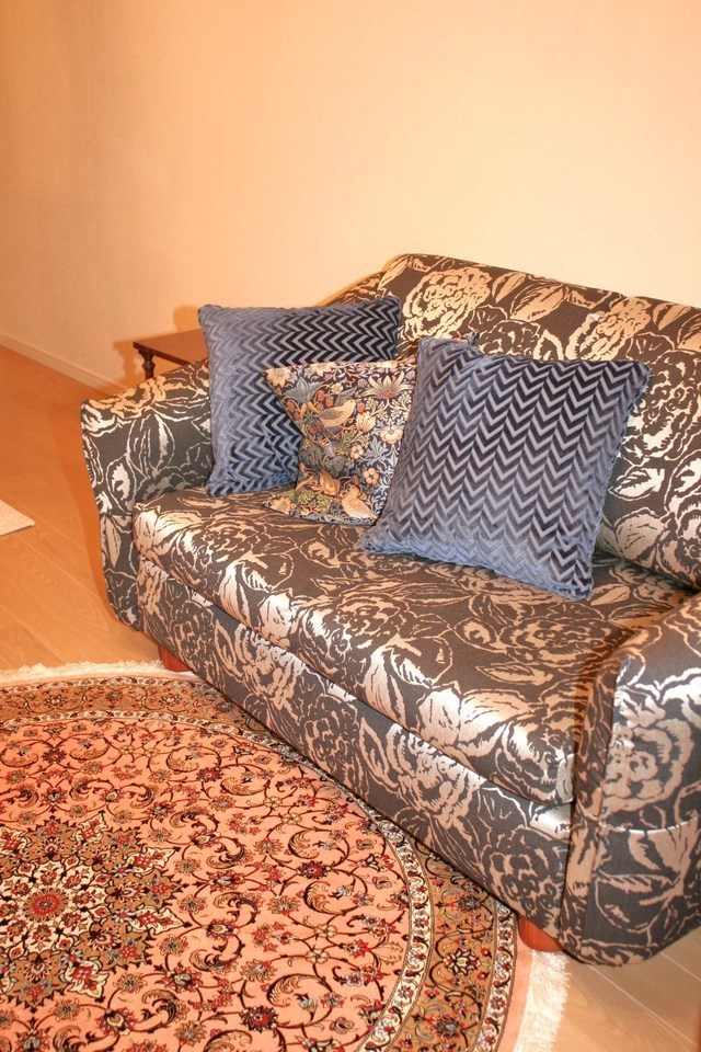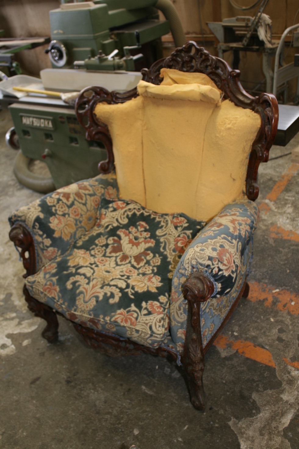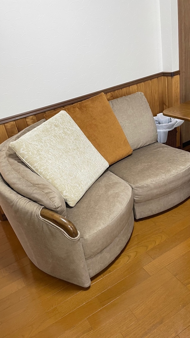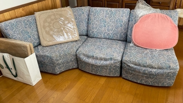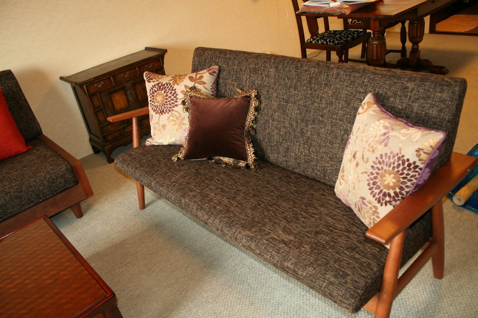 今までお使いのイタリア製の金華山織ソファセットは別の場所でお使いになるので木部の塗装直しをして、張り替えています。