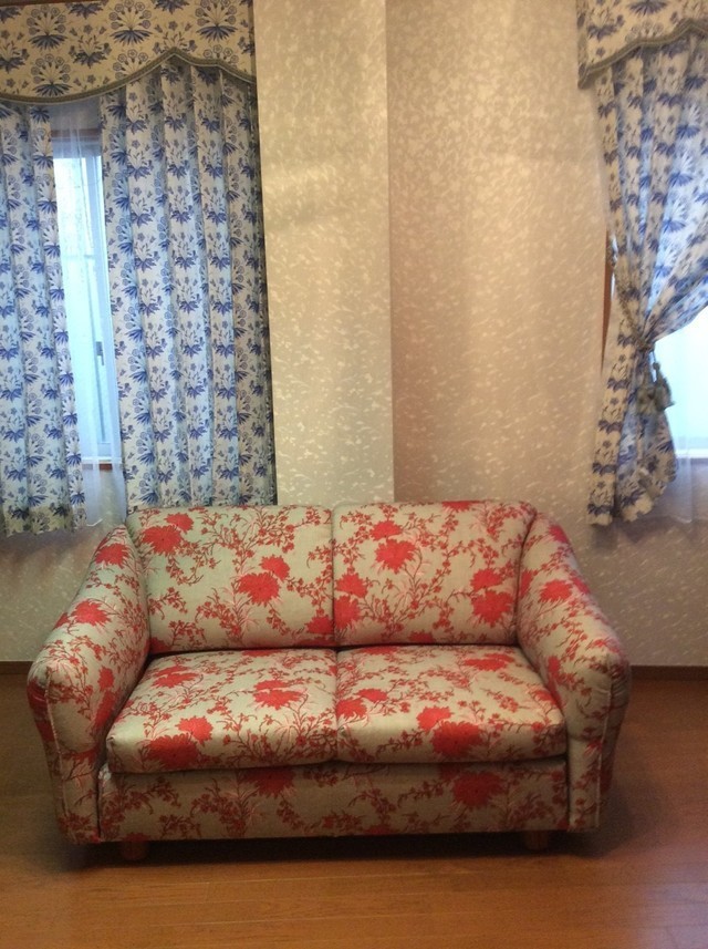 カーテンは、バランスカーテンを付けてデザインしてあります。ソファは座面を引き出すとベッドに早がわりします。