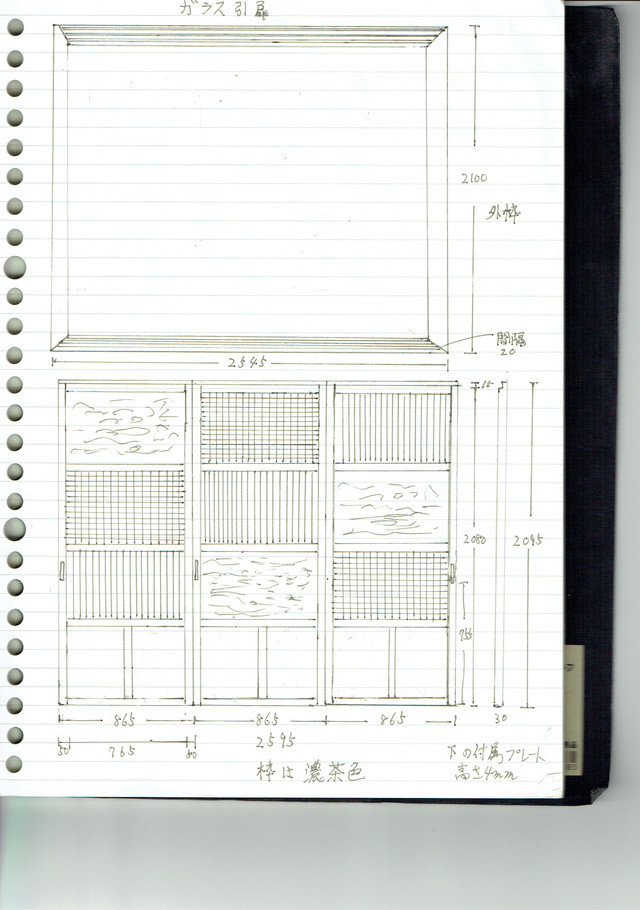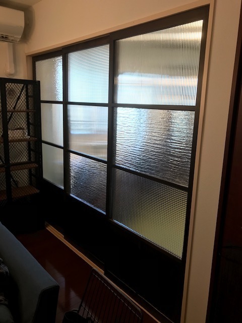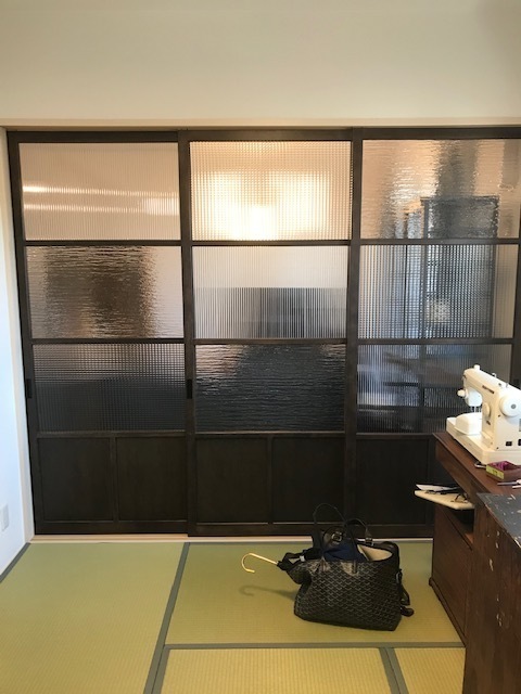 日本の古い物も好きななのでイメ-ジは大正浪漫です。木製のフレームをオーダーで作り優しい雰囲気になるように艶消しの焦げ茶にしてます。ガラスは、透明のものを選びストライプや四角の模様やウォ-タ-ガラスの3種類を使いランダムに入れています。この後、リビングの壁紙はウイリアム・モリスのブレアラビットで仕上げます。