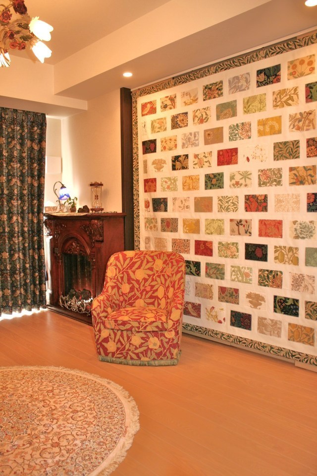 部屋の間仕切りとして扉一面にタペストリをお作りしました。ウイリアム・モリスの生地を中心に100枚以上の生地を張り付けて作られています。