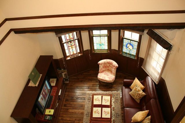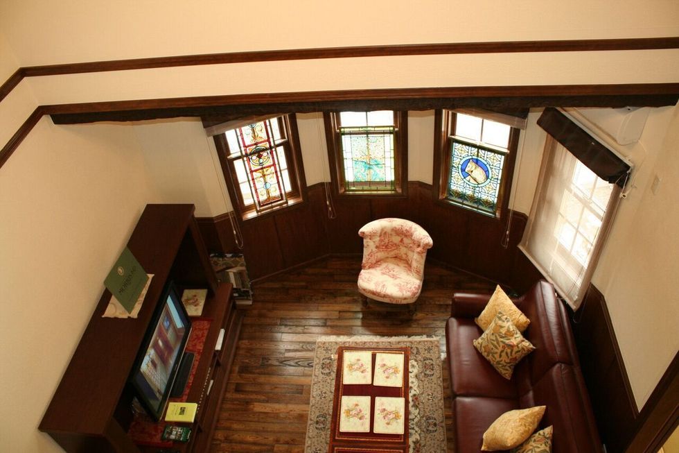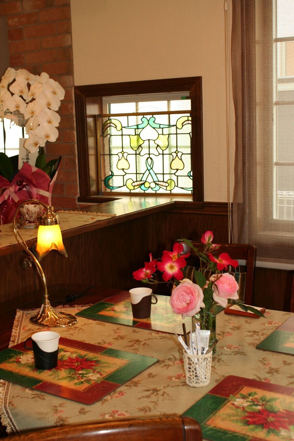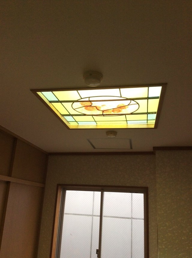 天窓の明かりとりがあり和室として使われていましたので障子がはめ込まれていました。洋室として使うのでステンドグラスを取り入れました。ファニチュアヒロシの店舗に展示してあるステンドグラスを見ていただきオーダーでお作りして、当店で取付まで行います。お客様のご希望がグリーンでしたので全体に淡いグリーンとパステル調のグリーンを合わせ中央はお客様のお好きなバラをデザインして手描きで作られています