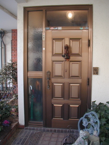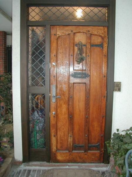 玄関ドアをアンティークオーク材の無垢のドアに交換してステンドグラスをオリジナルで作り使用しています。