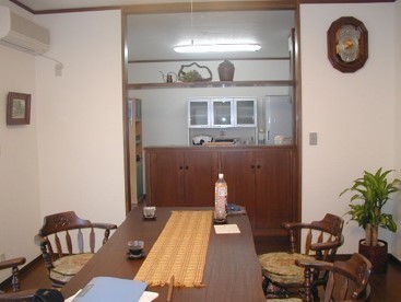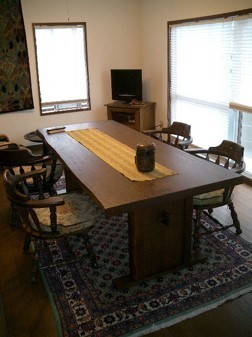 8畳間の広さを確保して、ダイニングリビングを兼ねた使いかたで低いテーブルにアームチェアで回転できるタイプで、テーブルは原木継ぎ目のない1枚板です。