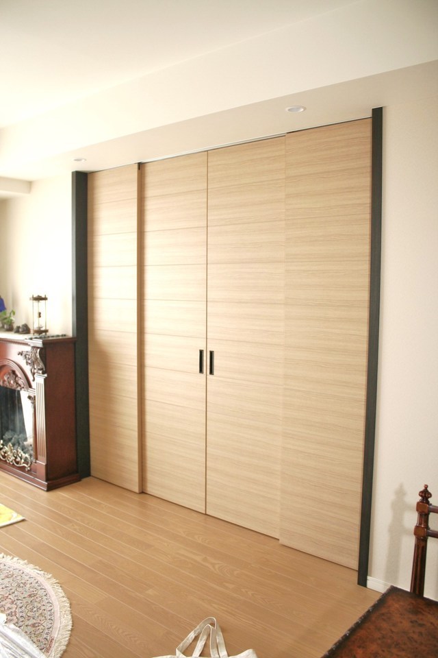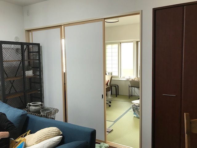 マンションに住むお客様のリビングと和室の間にある板ふすまです。南側に面して明るい部屋ですが、狭く感じるのでガラスの戸を作り光が入るように出来ないかとの相談です。
