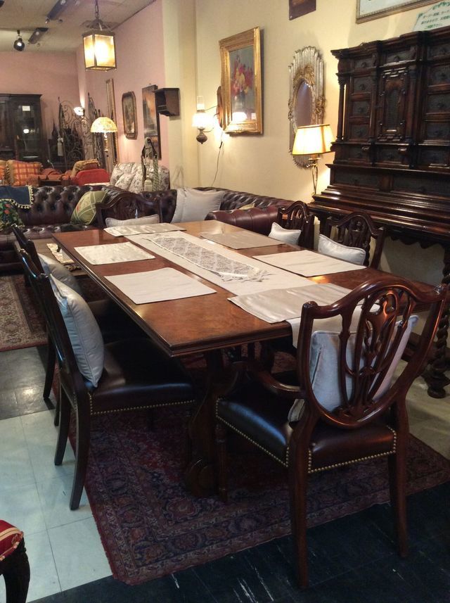 お得意様が新築されて今回納品したイギリスジョージアンスタイルのダイニングセットや前にお買い上げいただいたイタリア製メディア社のカップボードの相性がよく素敵でした。シャンデリアは、フランス製の手ふきのガラスに真鍮製の本体がアール・ヌーボーデザインで、塗り壁にピッタリでした。