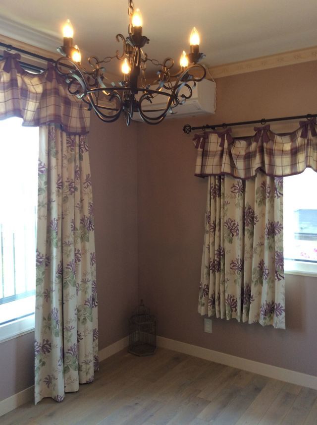 ウイリアム・モリスがお好きなお客様で、ソファに合わせて、カーテンはブレアラビットのブル-を選んでいただきました。3か所の窓で、幅360cmの窓を中心に幅180cmが2か所あり、すべてが同じブレアラビットの柄ではなくお好きな色の無地を合わせています。お部屋全体がフレンチテイストの家具ともマッチした素敵な雰囲気です。