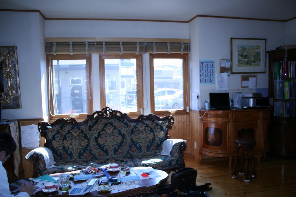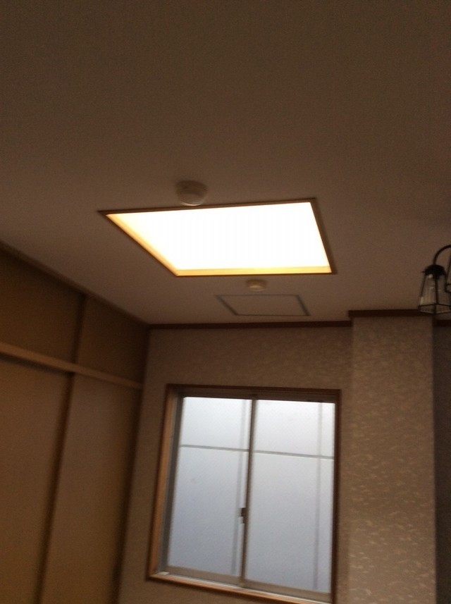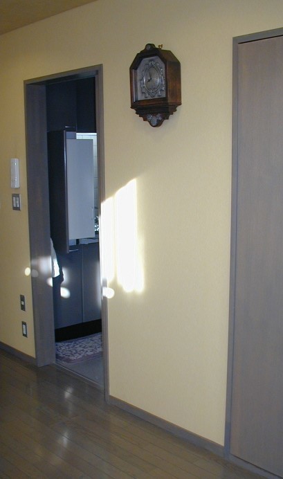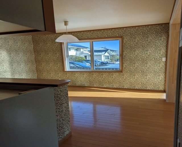 壁紙を貼り換え後、リビングを広くするリフォームした部分に地震の影響で亀裂が縦に入りました。これからも地震がくることを考えて、下地に襖貼りで使う技法で紙を貼りその上に壁紙を接着しないで浮いた状態にして両側から張感をだして仕上げる方法です。一日時間が過ぎると華麗に違和感なく貼り換え出来ました。