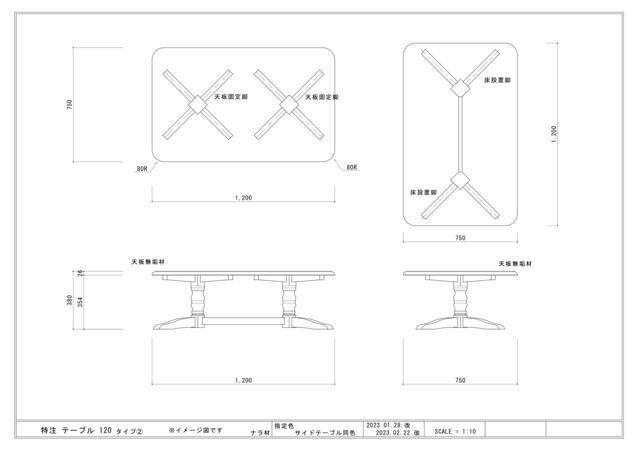 テーブルを使う場所に合わせて考え作ります。デザインの統一が問題になりました。今までお使いのダイニングテーブルを基準に考えデザインを考え図面を作り打ち合わせを何度か繰り返し図面やパース画での説明。