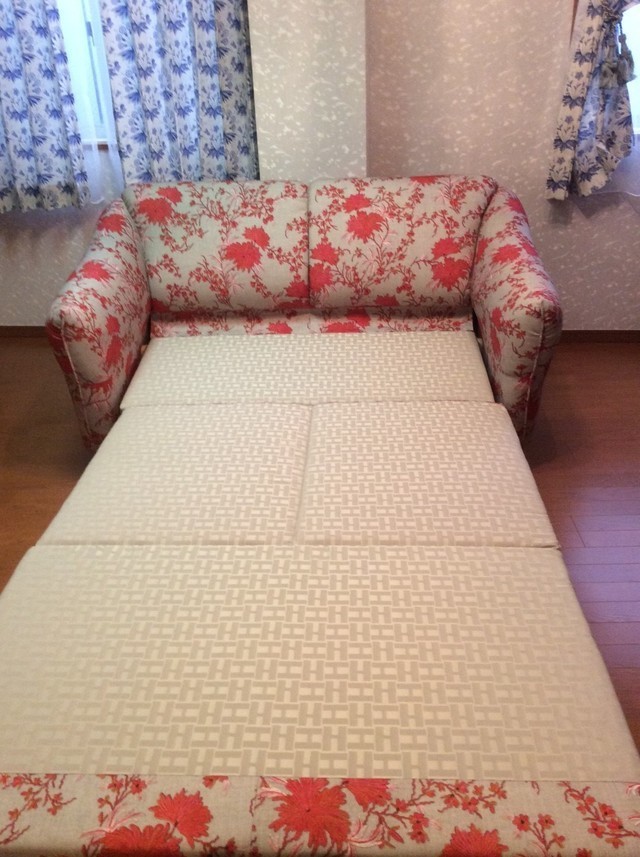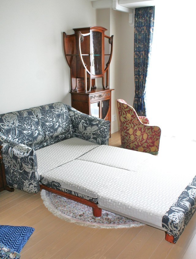 ドイツ製のソファベッドで普段は2人掛けのソファで座面を手前に引き出せばダブルベッドに早変わりします。寝心地も良く、足を伸ばして座ることもできます。