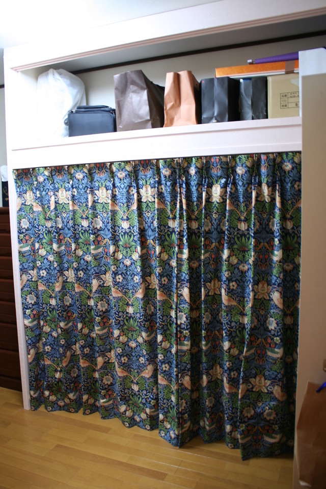 壁の珪藻土を塗り、ウイリアム・モリスの生地でデザインカーテンをお作りしました。