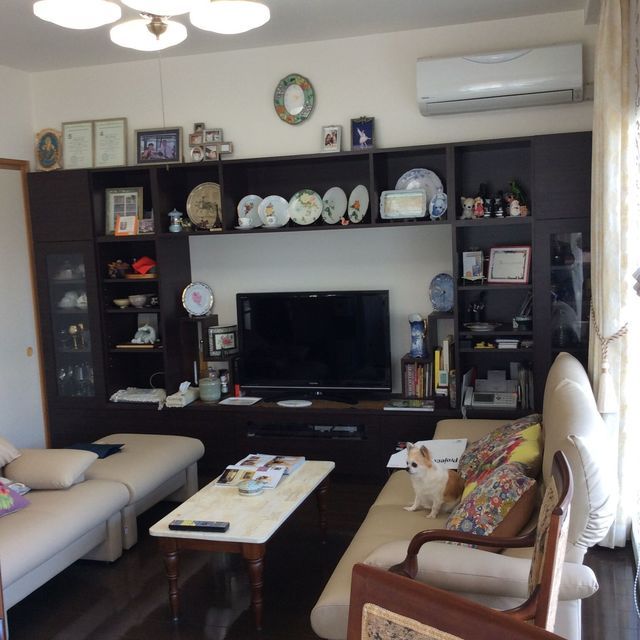 物が多くなり手の付けようがない状態でお得意様からご相談をいただき、暮らしに合わせお部屋のレイアウトを変えたり、ソファを交換して、窓回りにたっぷりの収納サイドボードを取り入れ、窓にも飾りをつけて装飾背をだしてスワックを付けています。ワンちゃんを飼っているのでソファを布張りから革張りに交換して大正解でした。