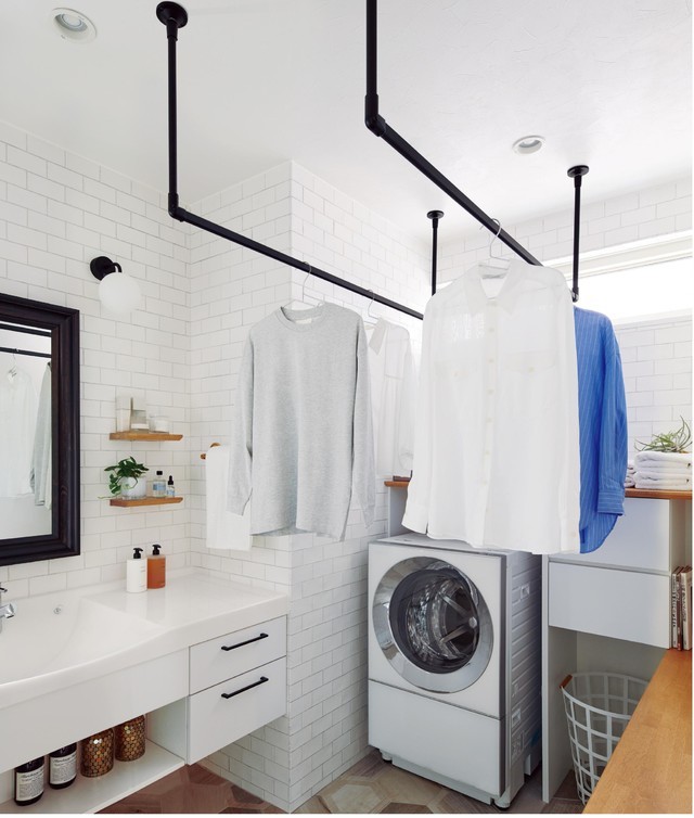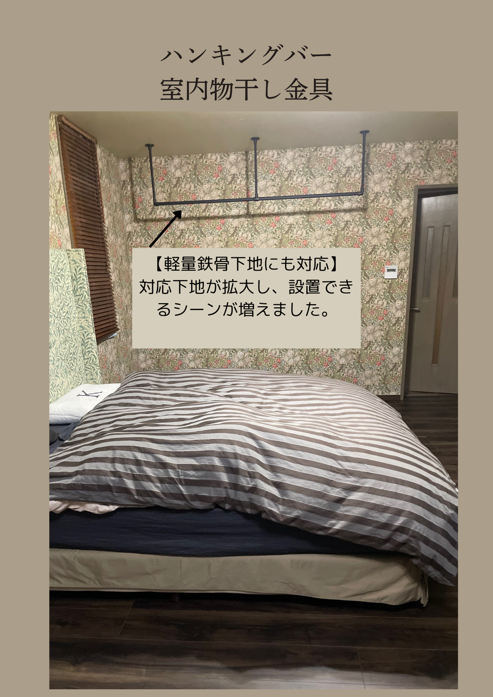 お部屋のリフォームに合わせて室内用ハンキングバーを取り付けました。洗濯後の物干しとして使うだけでなくシーズンで着る洋服を掛けるハンキングとしても便利です。黒のフレームで見た目がスッキリしていて、どこの場所でもいいのでお勧めです。