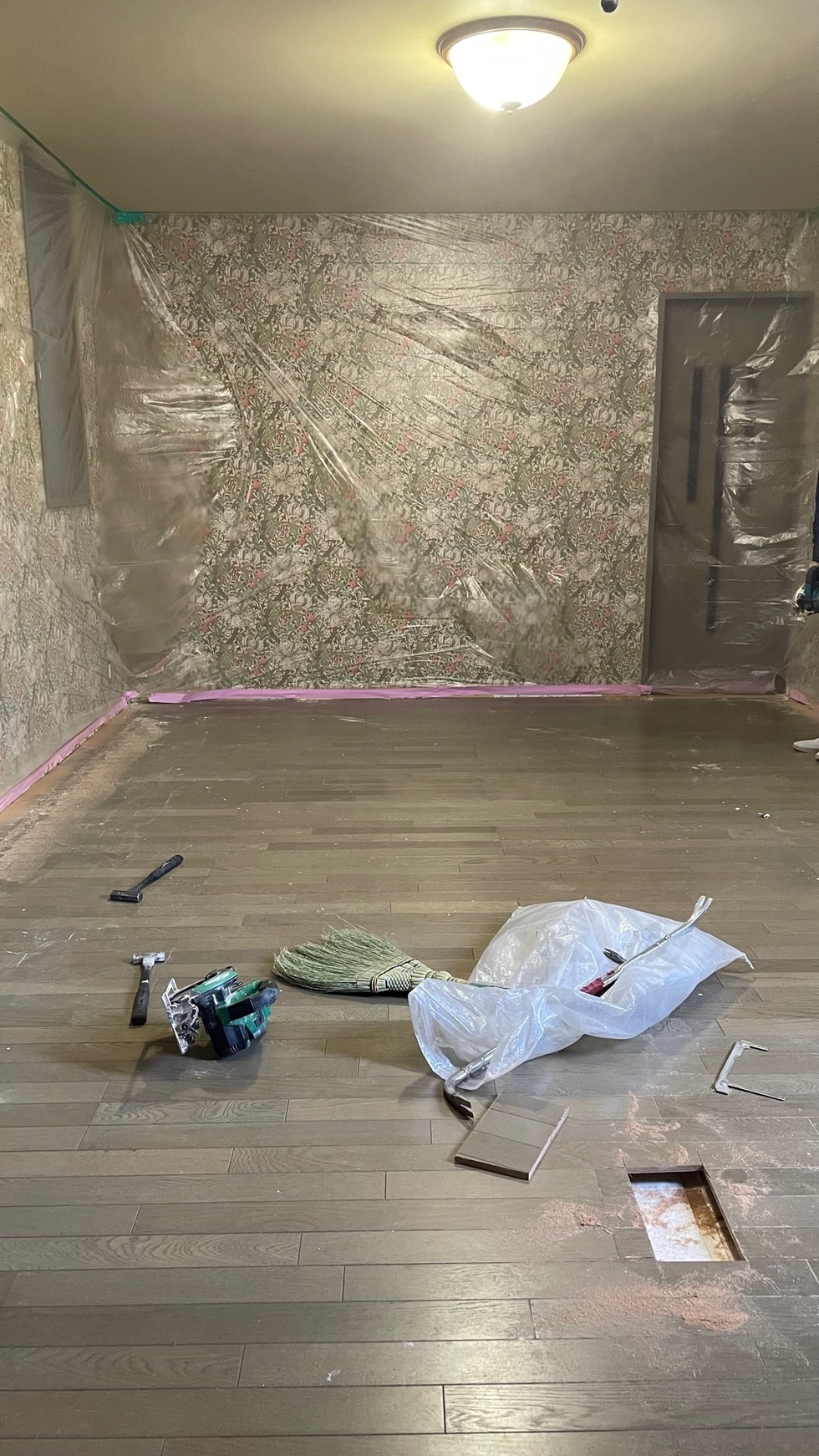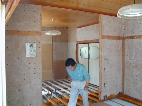 床暖房の工事をして、壁の中央部分を天井までオープンにしています