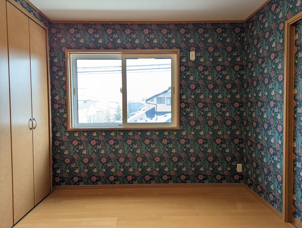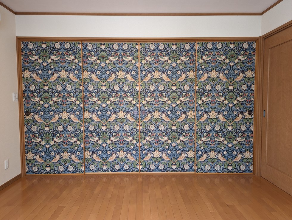 洋室と寝室の間にあるふすまを洋風に変えるためにモリスの壁紙を使い大胆にイチゴ泥棒の壁紙を使いました。