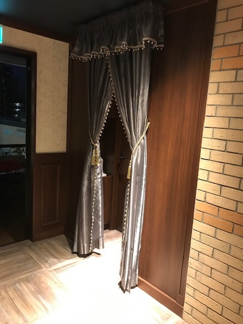 床はアイボリー調のMATCHSTICKを使い、デザインカーテンが付けられています。