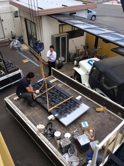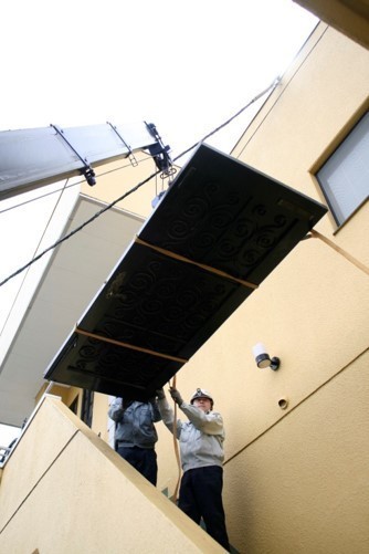 玄関ドアを外して、クレーンで運び出しました。
