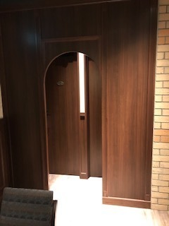 ドアは修理して塗装仕上げで、壁は剥がして断熱材を入れて仕上げはSULKING ROOM PINKの色で塗装をしています。天井下にはモールディングを廻しています。