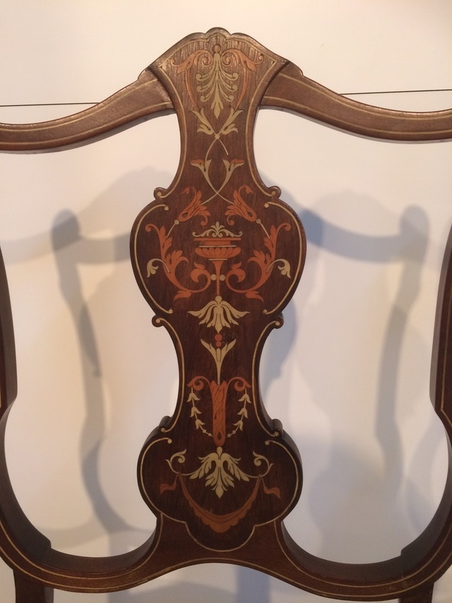 レストレーションチェア・・・・・ハイバックチェアは すべてに彫刻や細工がしてあり背や脚の縦棒には、挽き物(ろくろ)で横棒の背板貫などに渦巻きや王冠が施されている。