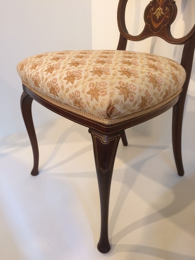 ヘップルホワイトスタイルの代表的な物としては、シールドバックチェアーやオーバルバックチェアーがあり、特徴は背の部分が盾形やハート形で脚の部分が直線的で下にいくほど細くなり、繊細な彫刻が施してあります。