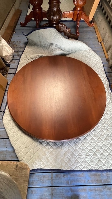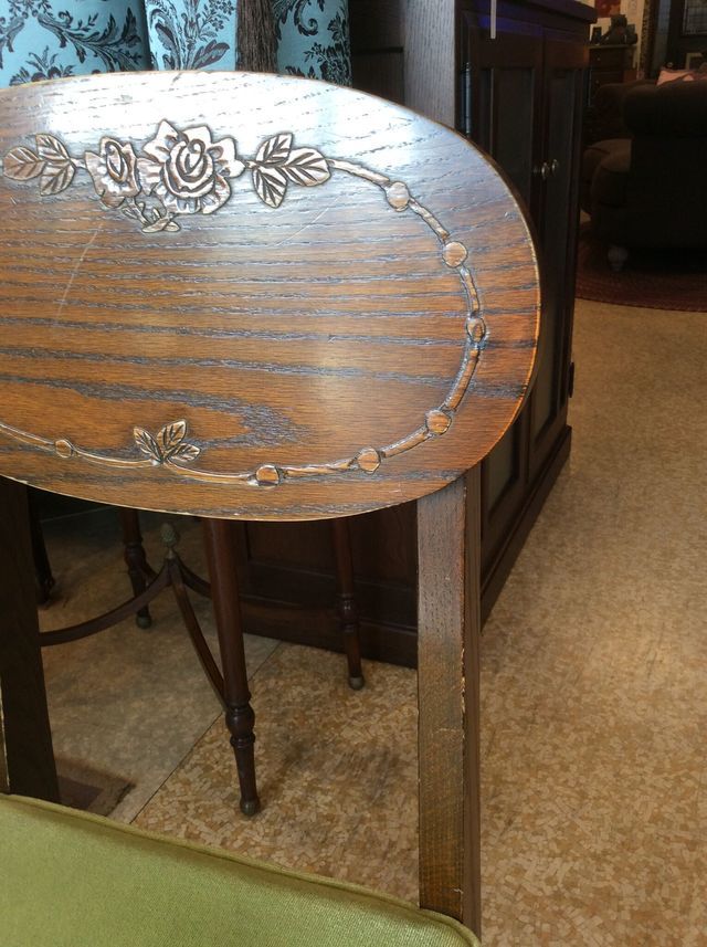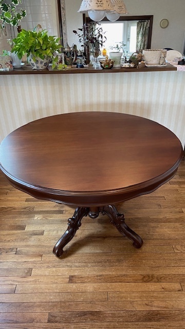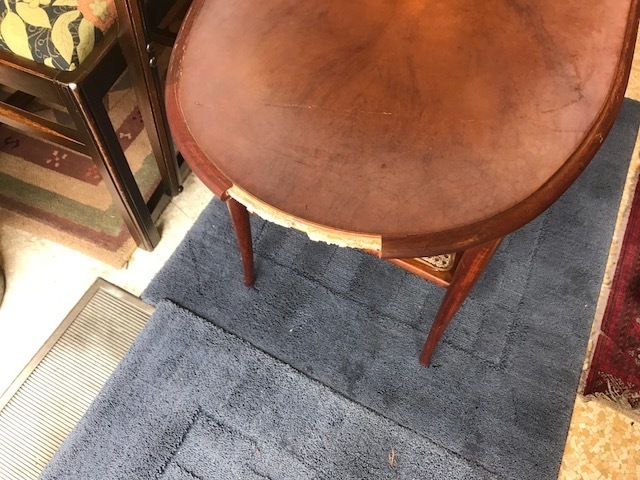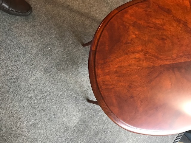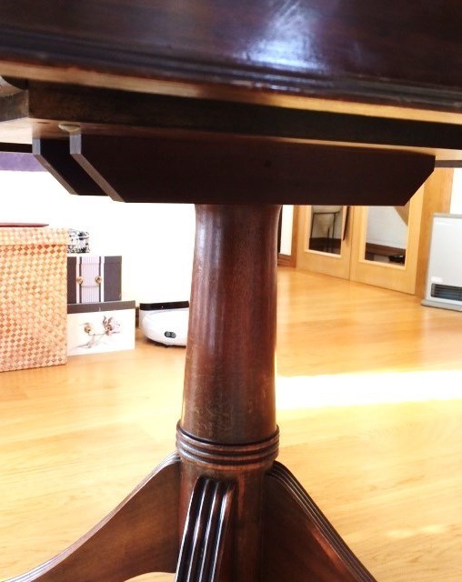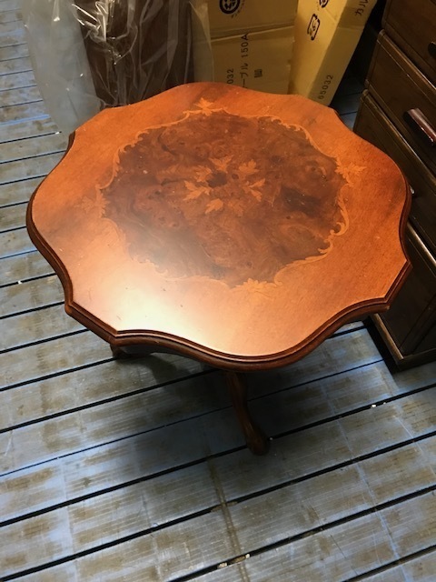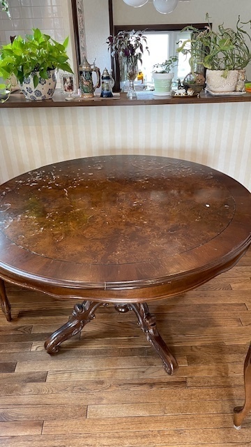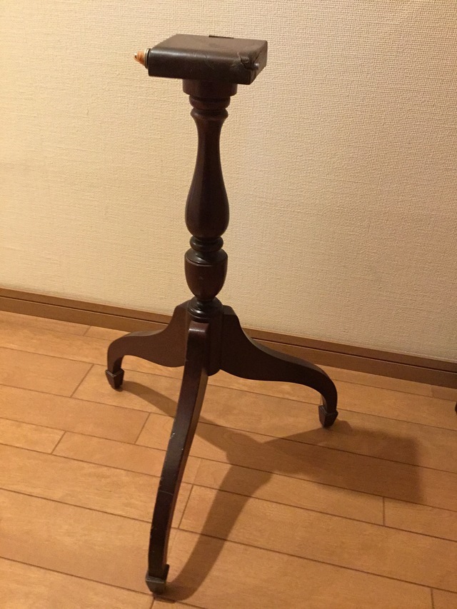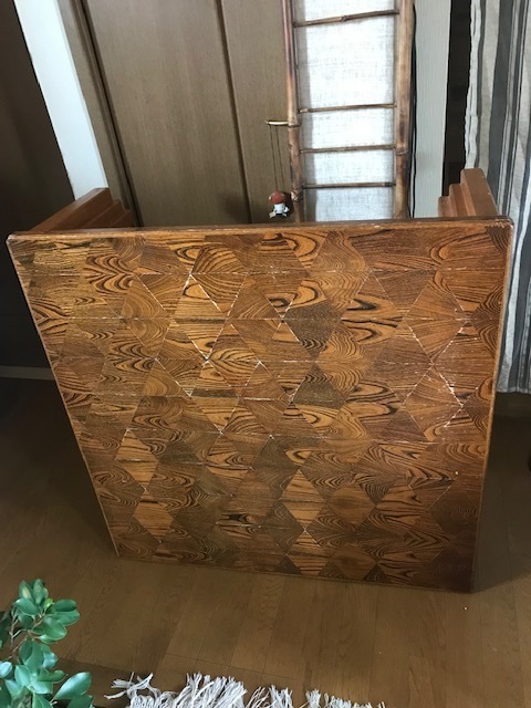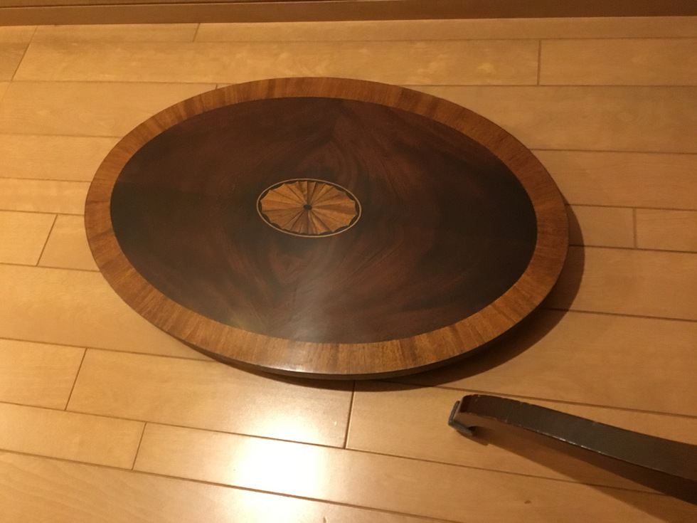 素敵なイギリスビクトリアンデザインのコーヒ-テ-ブルで、マホガニー材に象嵌モザイクが施してあります。天板を使わない時に立てられるタイプの珍しいもの。家で倒れて以前不完全に修理した可動部分が外れてしまい、修理も難しそうでもう使えないのではないかと半ばあきらめかけていた所、偶然ネットで貴店のことを知り修理をお願いしたものですが、大正解でした。本当にプロの技で丁寧に、補修、強化頂きました。 早速部屋に飾りましたが、まさに蘇った感じで家内共々嬉しく、お礼の気持ちで一杯です。
