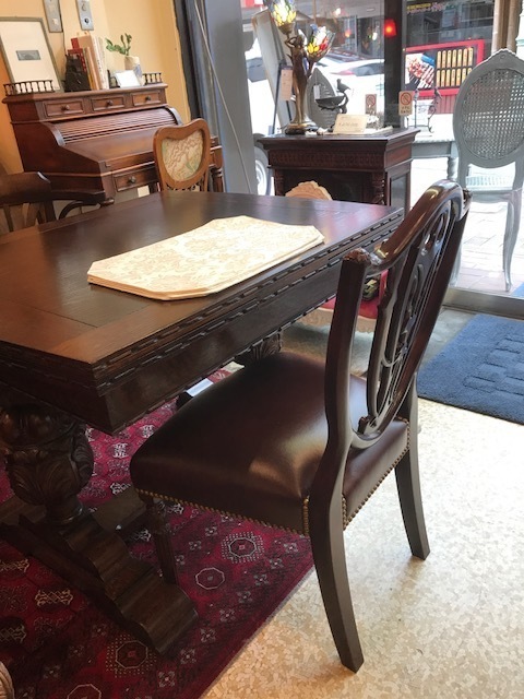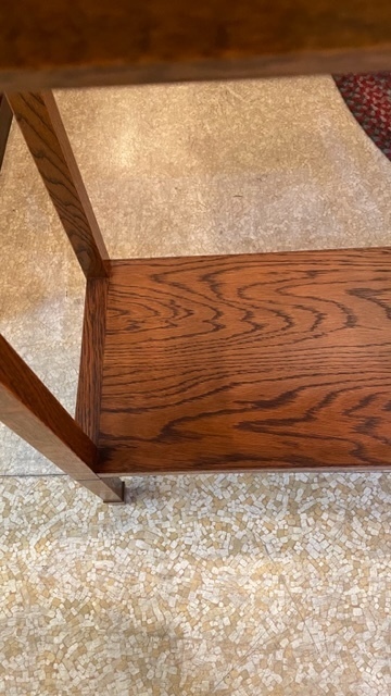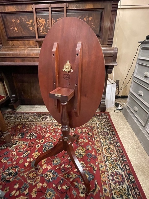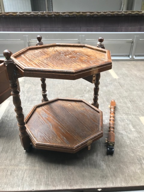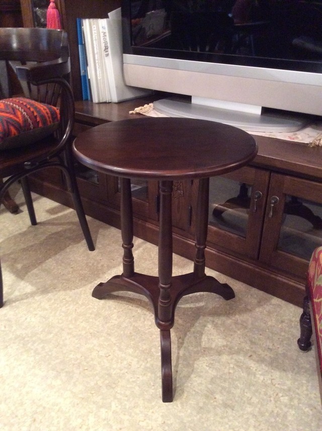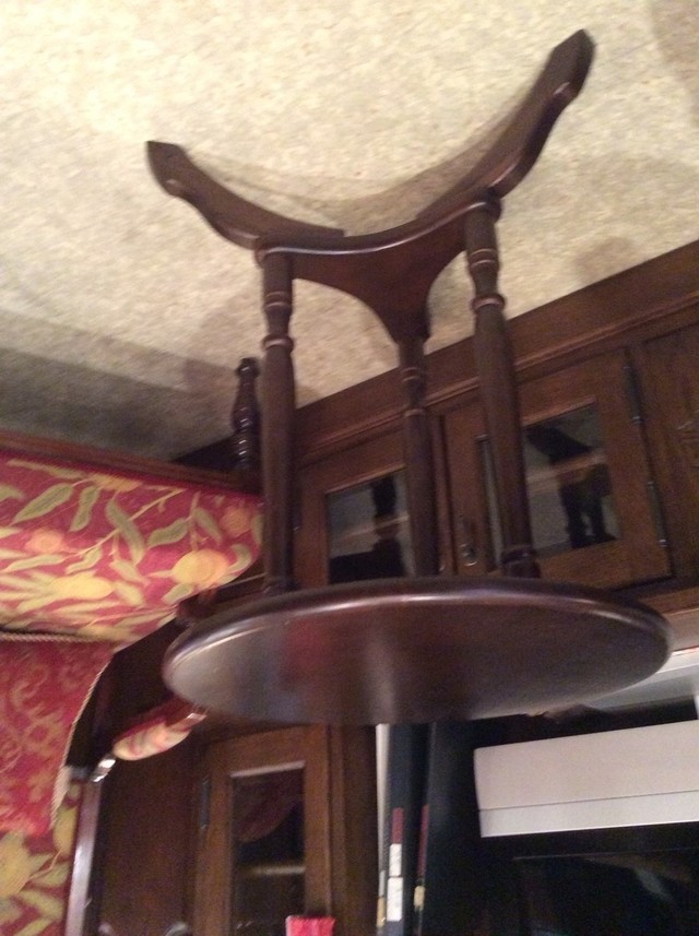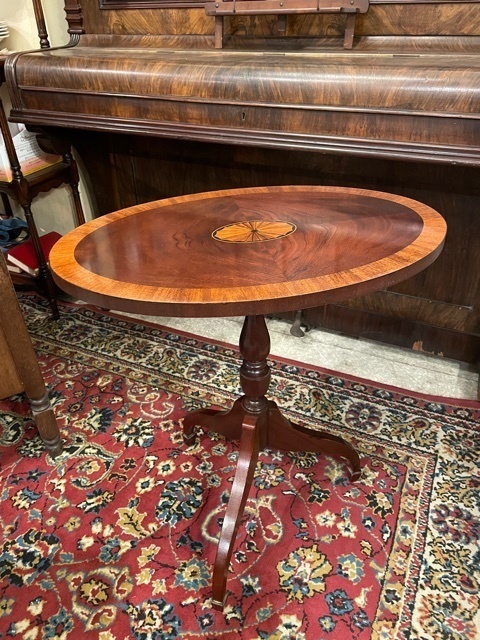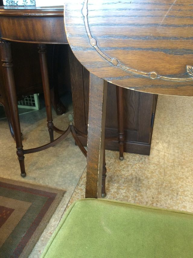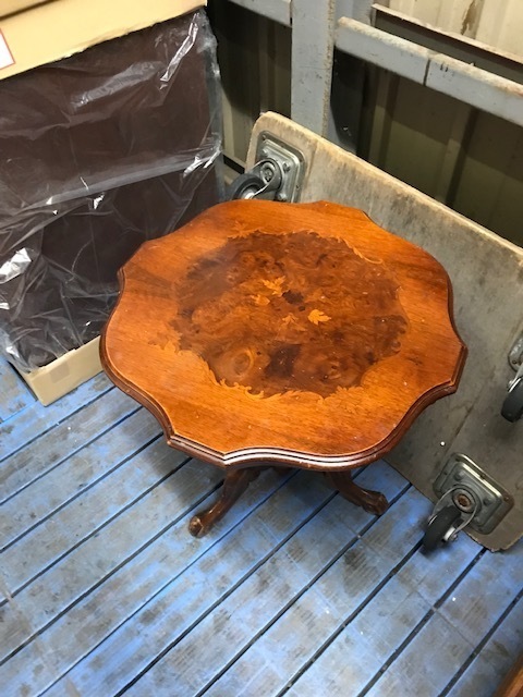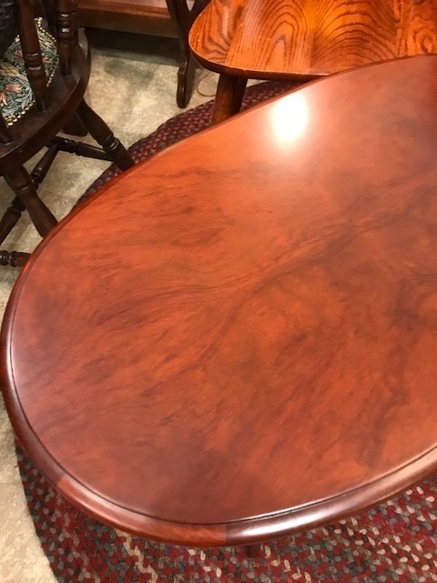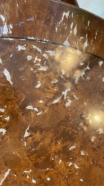 素敵なイギリスビクトリアンデザインのコーヒ-テ-ブルで、マホガニー材に象嵌モザイクが施してあります。天板を使わない時に立てられるタイプの珍しいもの。家で倒れて以前不完全に修理した可動部分が外れてしまい、修理も難しそうでもう使えないのではないかと半ばあきらめかけていた所、偶然ネットで貴店のことを知り修理をお願いしたものですが、大正解でした。本当にプロの技で丁寧に、補修、強化頂きました。 早速部屋に飾りましたが、まさに蘇った感じで家内共々嬉しく、お礼の気持ちで一杯です。