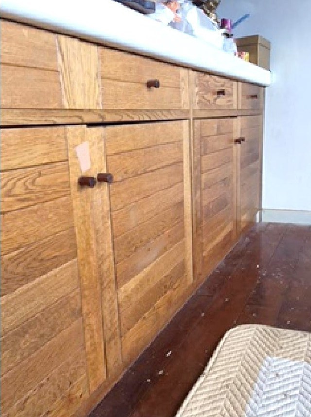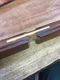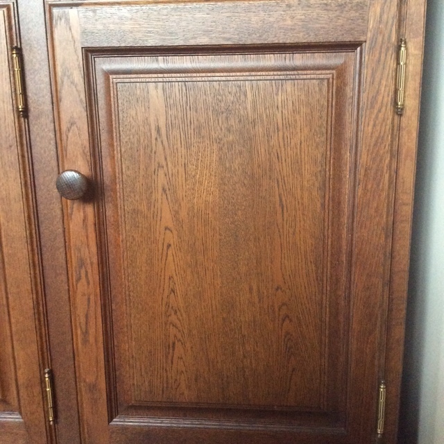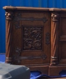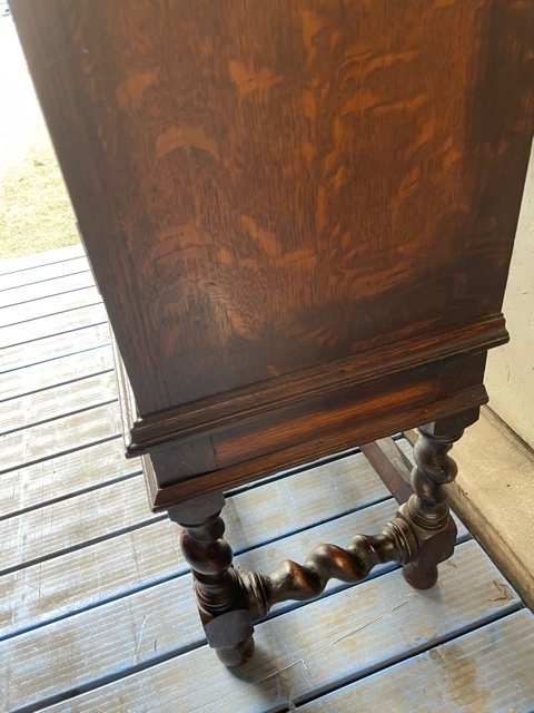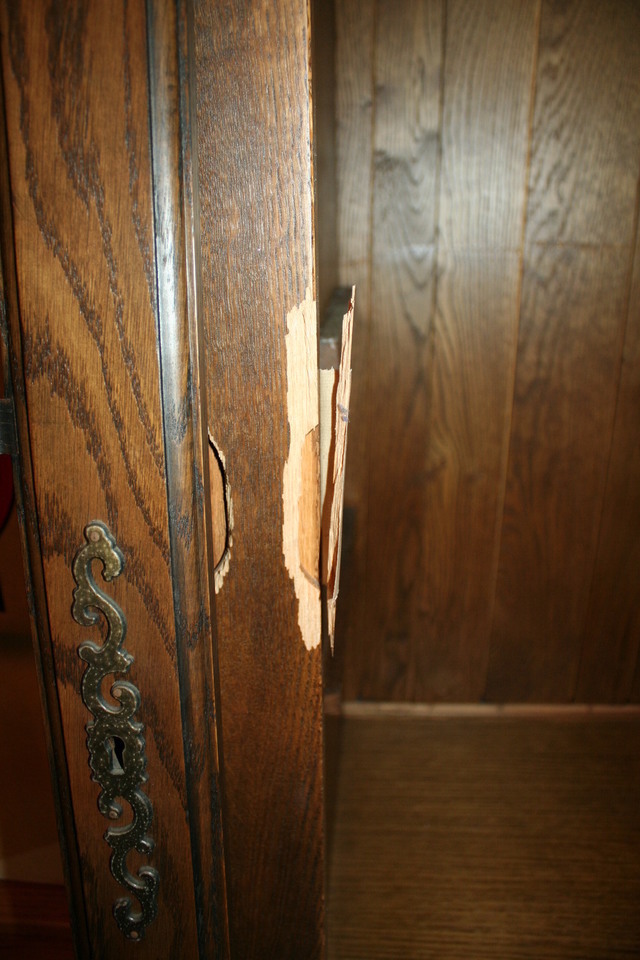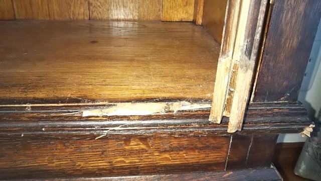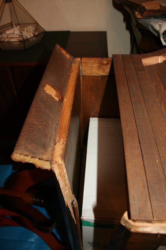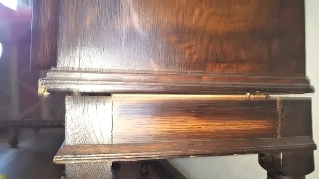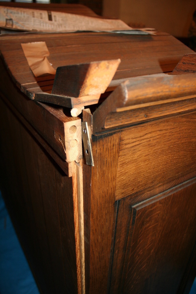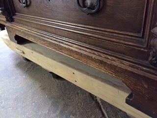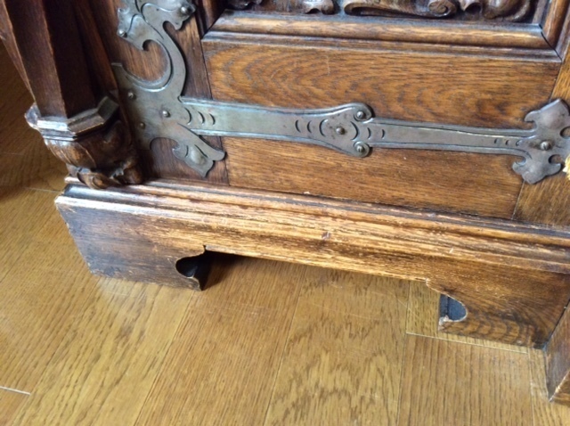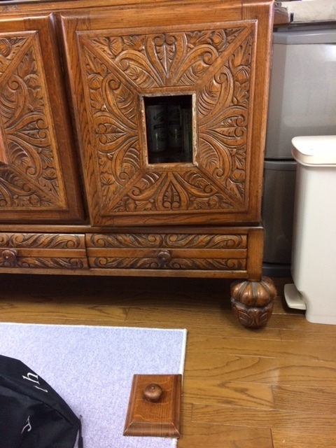 25年前に納めたキャビネットですが長年の間に犬のひっかきキズや壊れた部分などを直しました。ひっかきキズは深いので直し方が難しく、彫刻の飾りが無い部分を作ります。