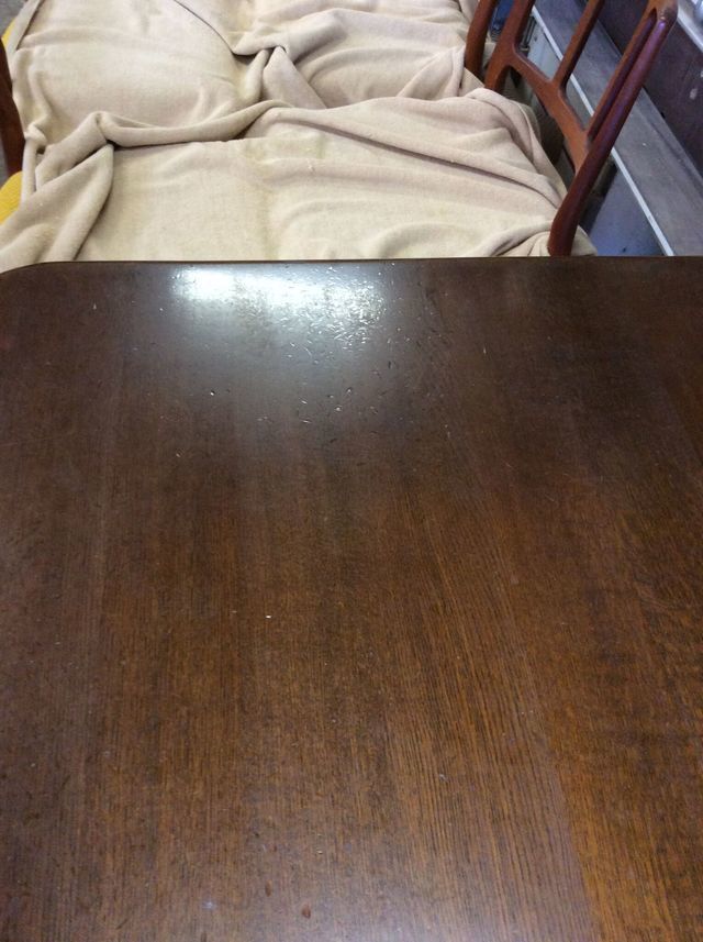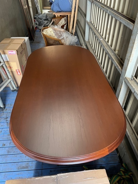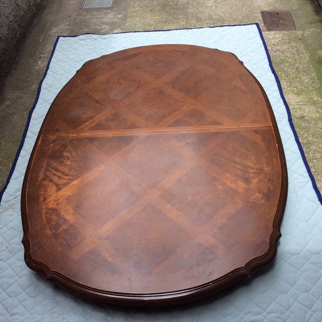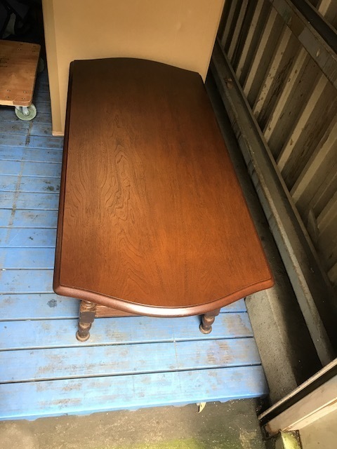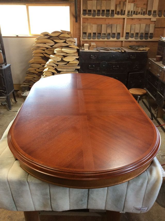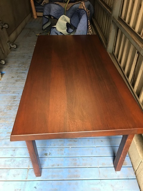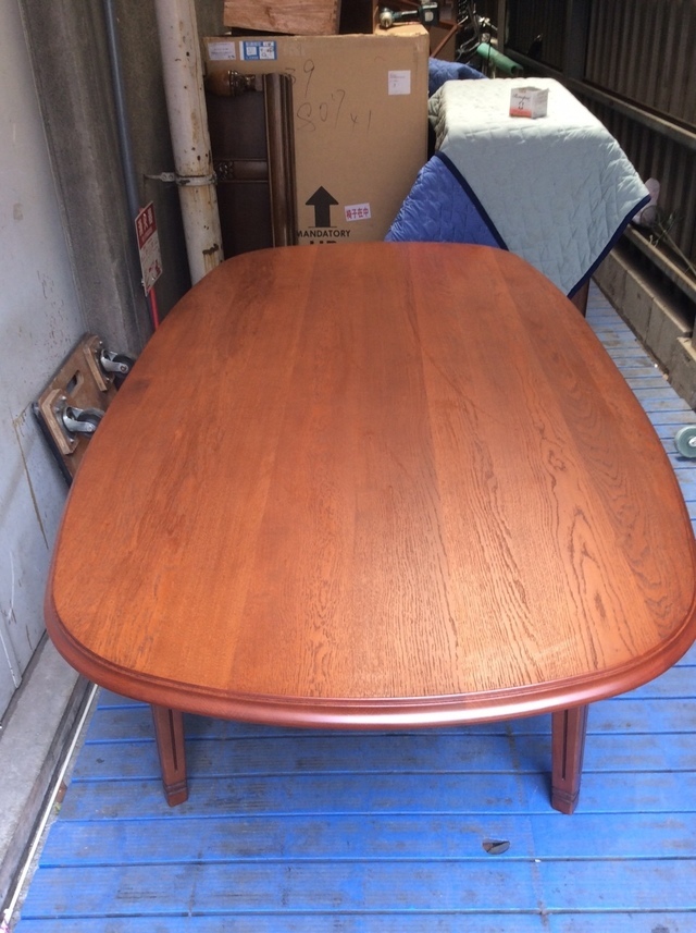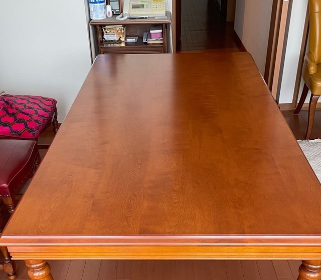 伸長テーブル230cmの長さで、普段は小さくして使われていました。天板突板(合板)の劣化が再塗装ではよい状態まで仕上げることが出来ないので、表面の板を剥がして貼り替えています。その後、回り面も角を落としてバランスを取りウレタン塗装仕上げです。