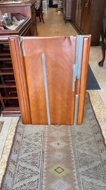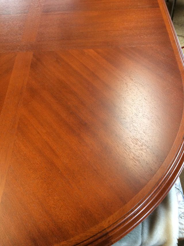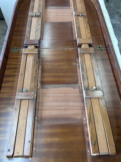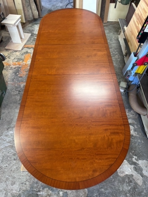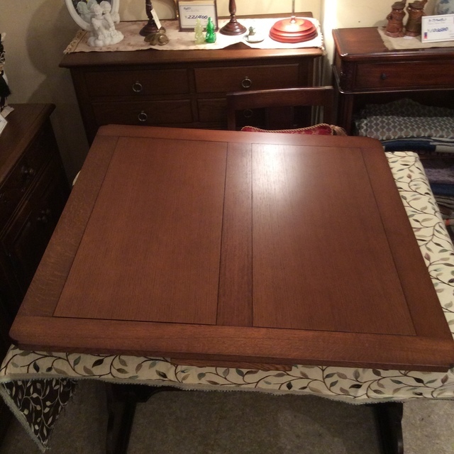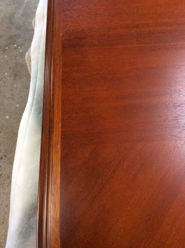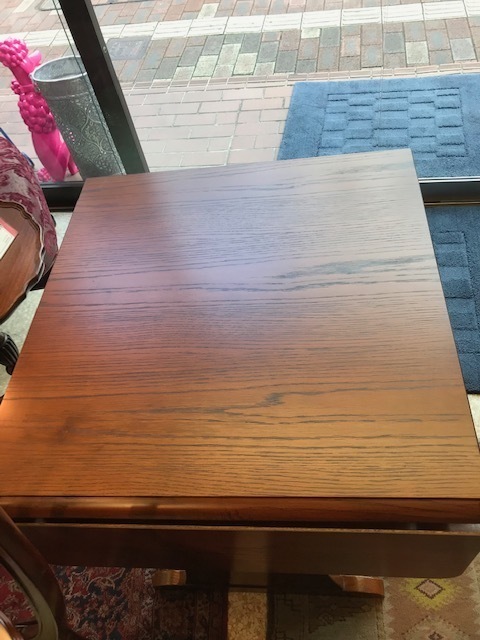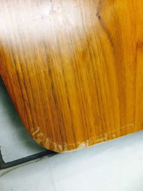 伸長テーブル230cmの長さで、普段は小さくして使われていました。天板突板(合板)の劣化が再塗装ではよい状態まで仕上げることが出来ないので、表面の板を剥がして貼り替えています。その後、回り面も角を落としてバランスを取りウレタン塗装仕上げです。