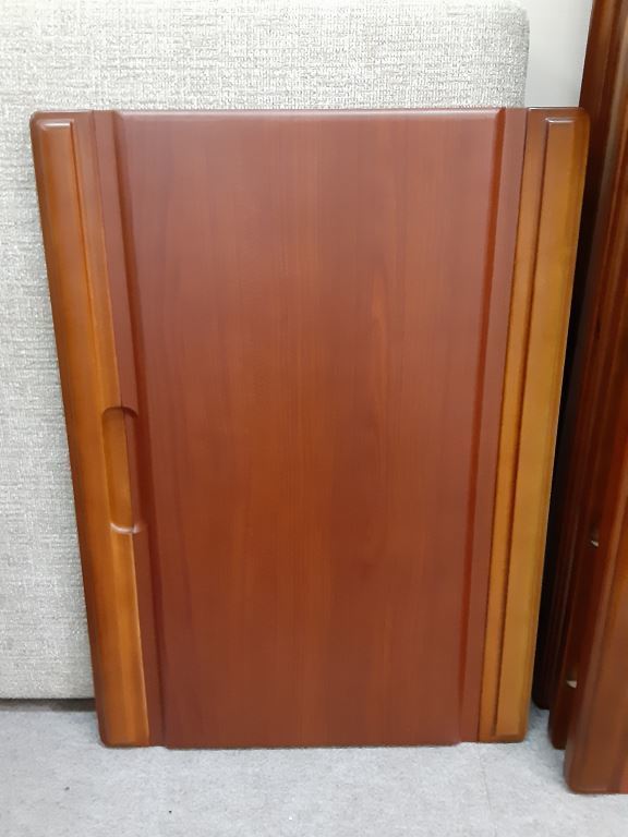 桐材の無垢なので、表面を数ミリ削りモダンなウォ-ルナット色の塗装で仕上げました。手が当たる部分のうねりを少し深くしています。変化をつけて一枚板の優しい手触りが感じられ木目がきれいに見えるような仕上がりです。
