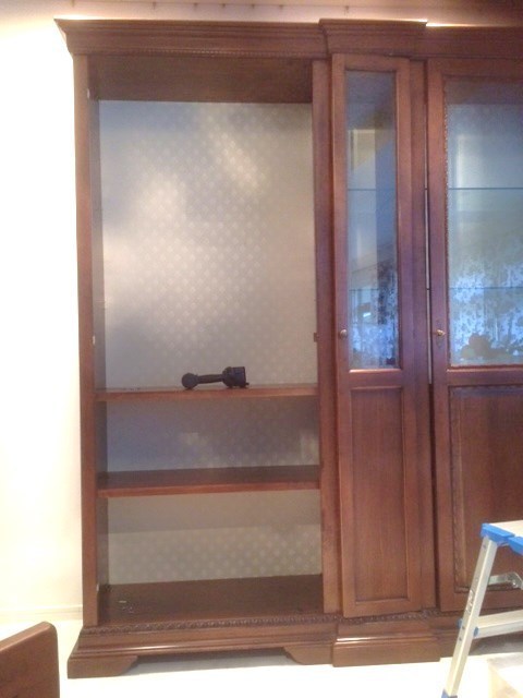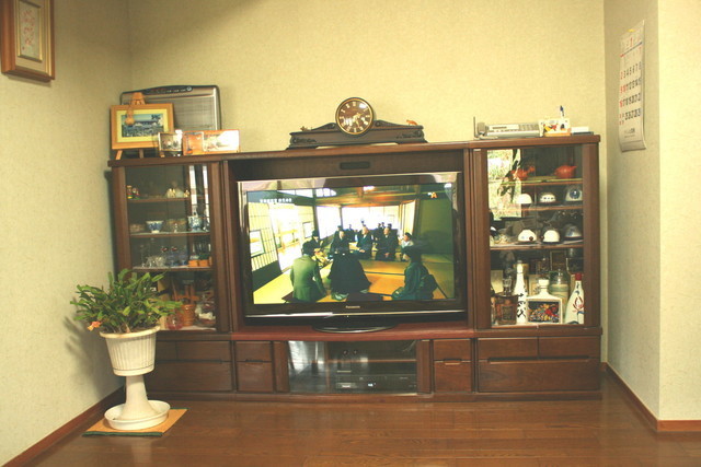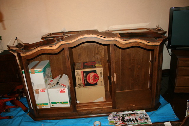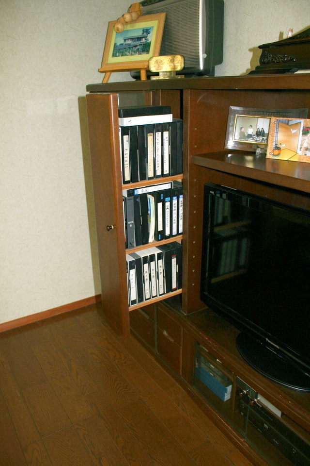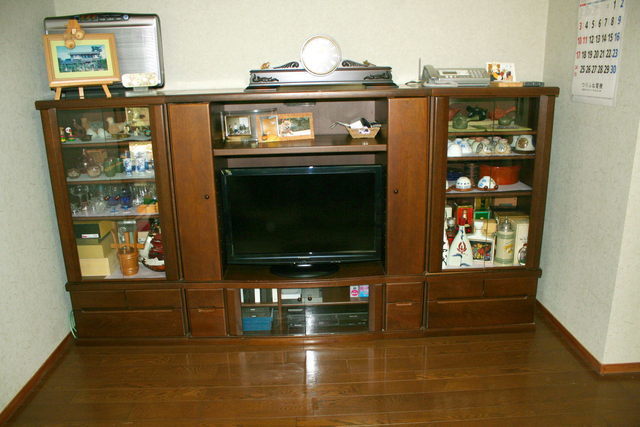 テレビの両サイドの引き出し部分にVHSビデオテープを収納する棚がありましたが使わなくなりましたので取り外しスッキリです。引き出しの仕切り板をはずしテレビがゆったりと置こことが出来、内側は板をはずした部分の手直しやシートを張り仕上げました。