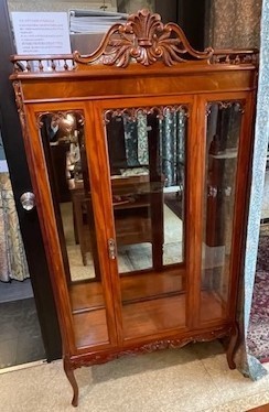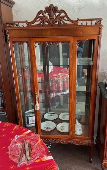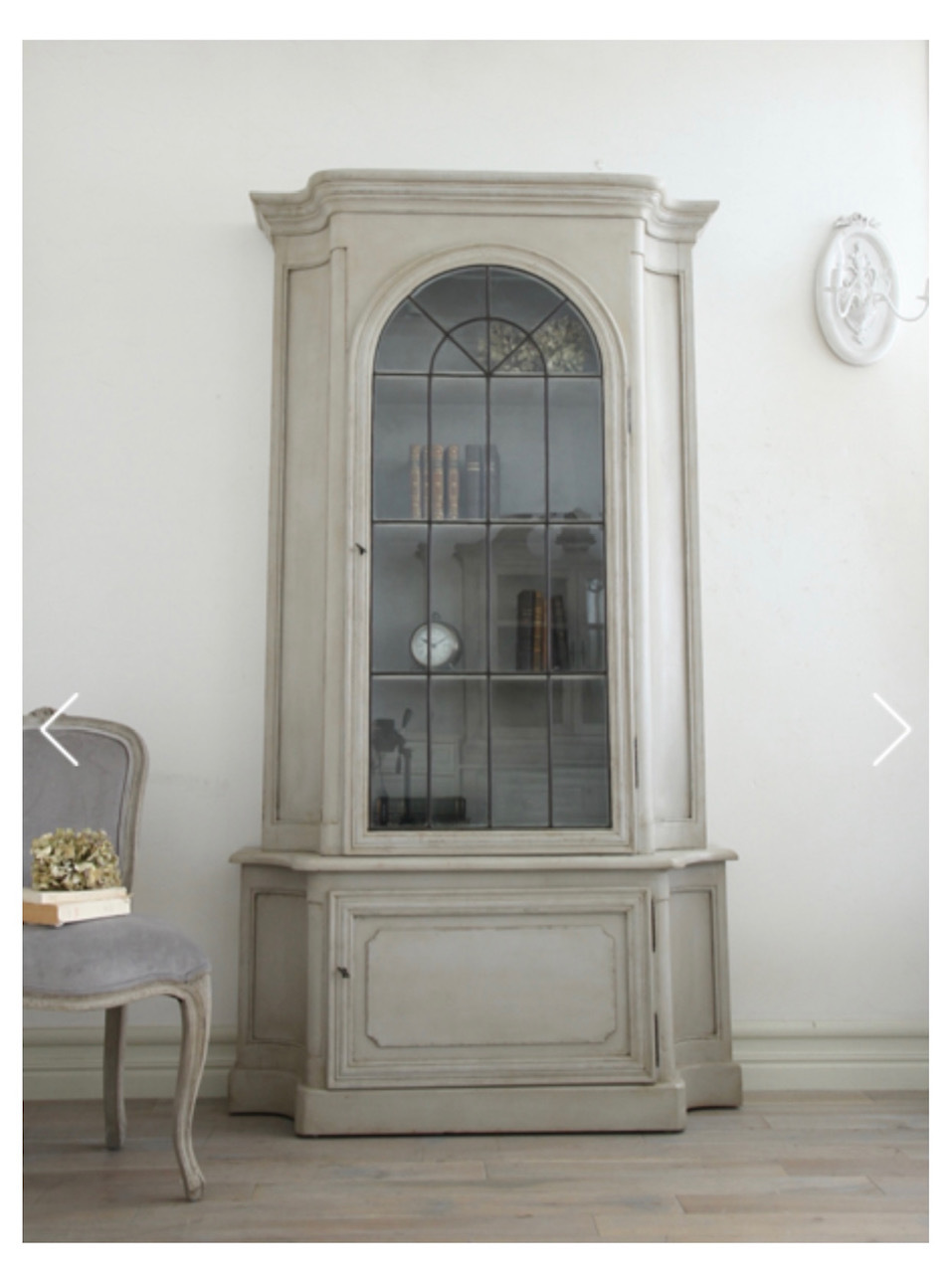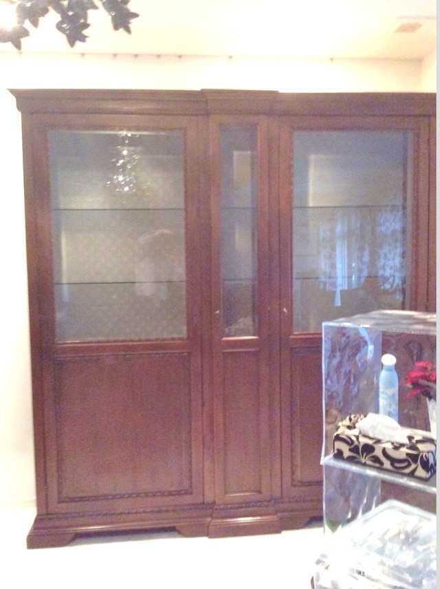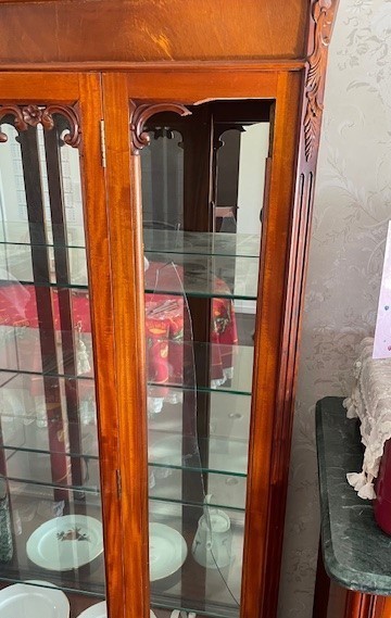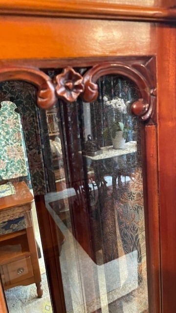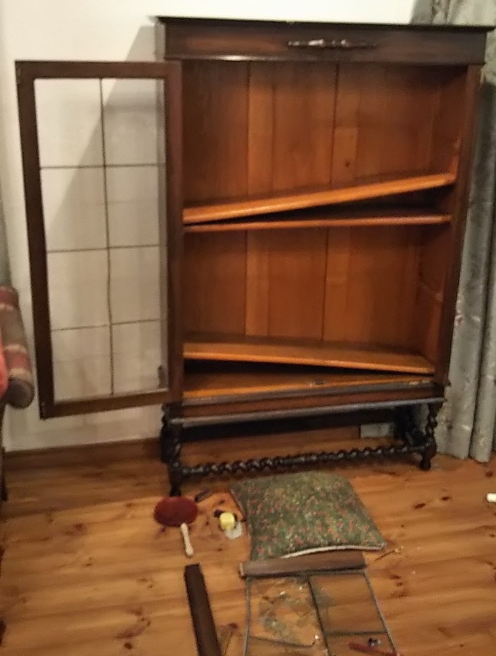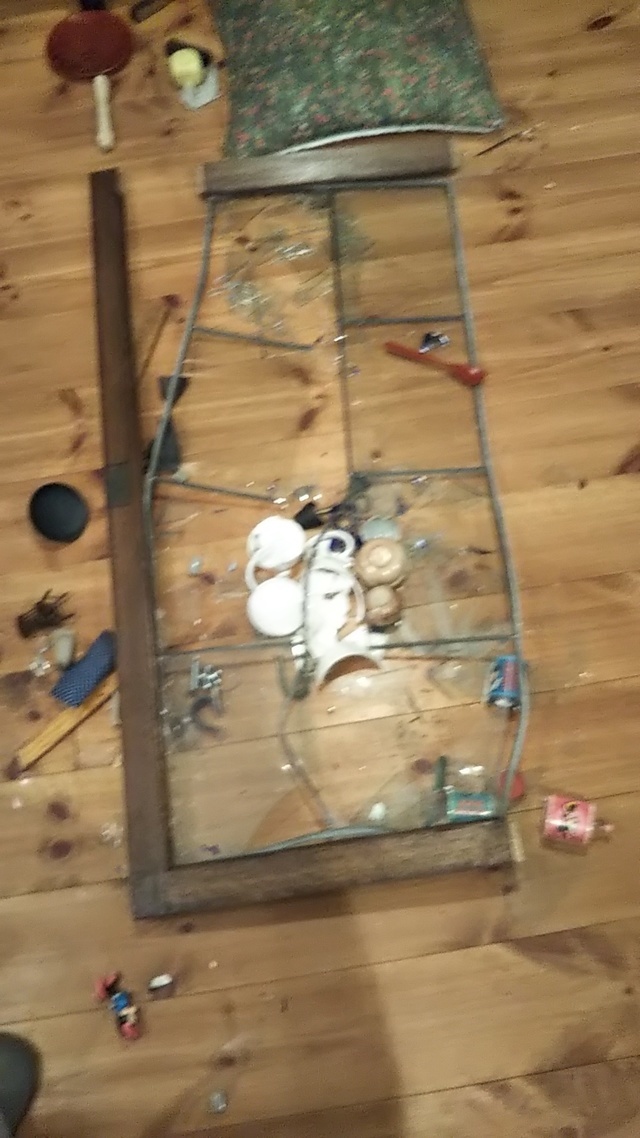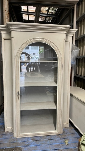 フレンチカントリースタイルのガラスキャビネットの地震で倒れてステンドグラスが壊れて、本体も破損しました。
