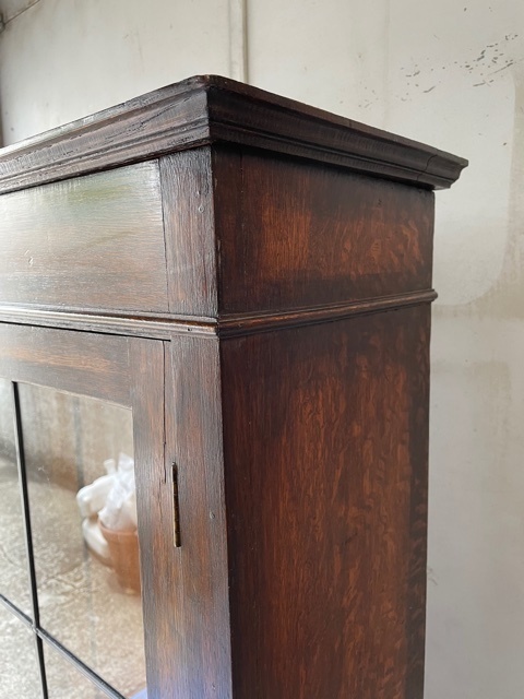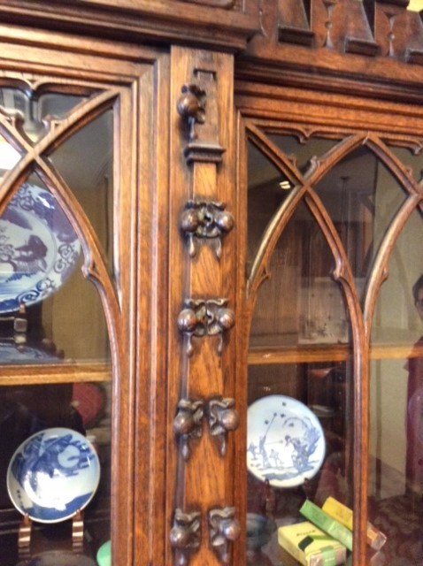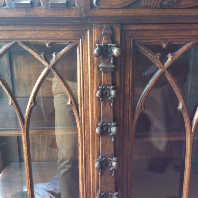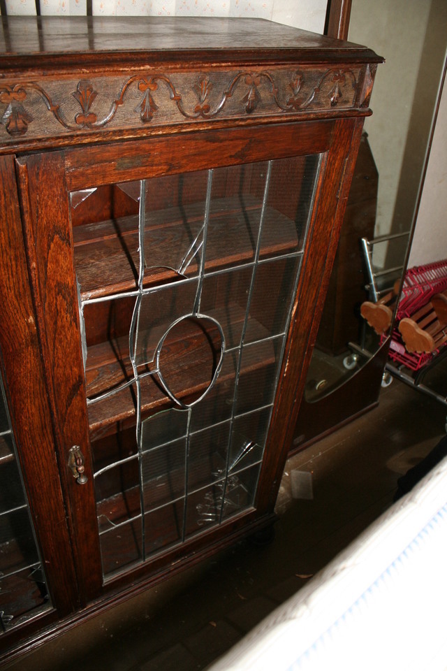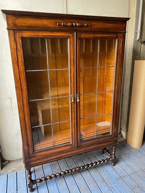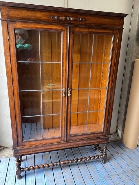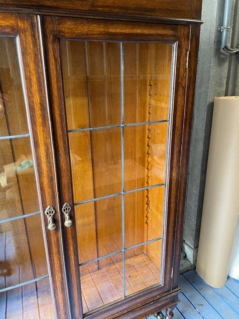 震災で壊れた家具は痛々しい状態のものででした。多くの皆様の思い出の家具を、長い時間をいただき修理しました。イギリスアンティーク家具のブックケースです。ステンドグラスのガラスは粉々に割れてしまい鉛のフレームも曲がり修理のしようがないほどの状態でしたが、ステンドグラスの職人さんが長い時間かけて同じような古いガラスを探しフレームも古い感じを損なわないように作りました。