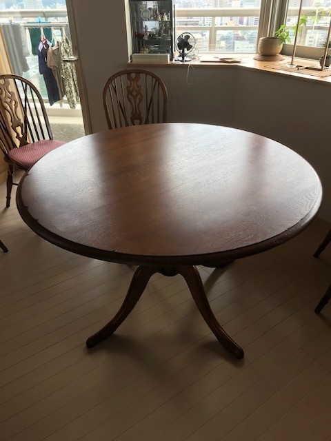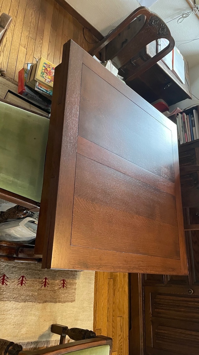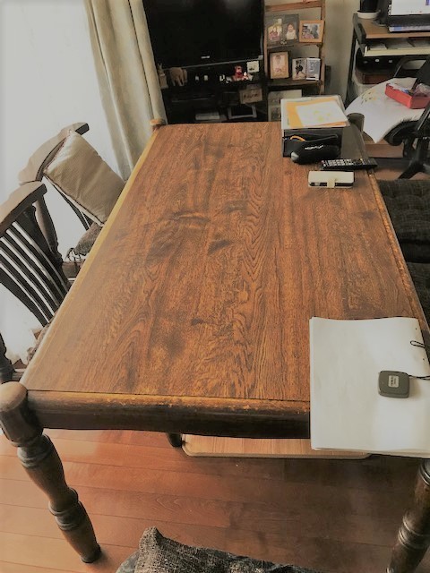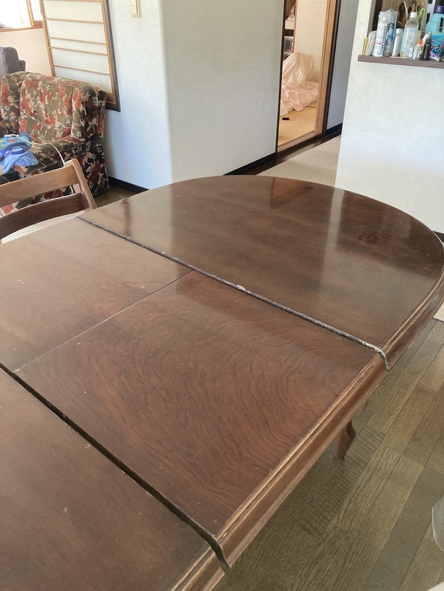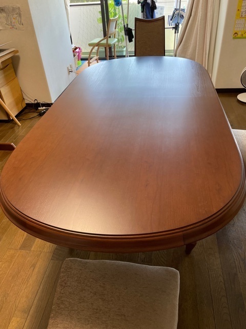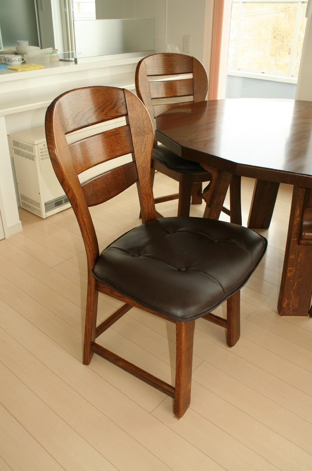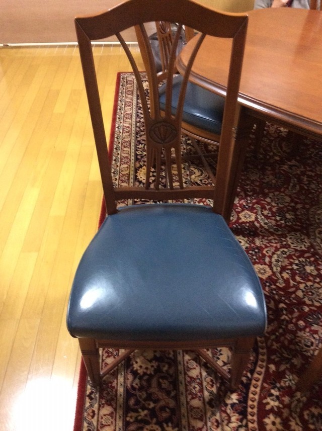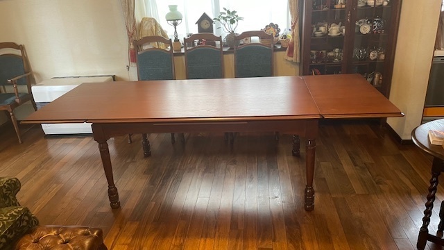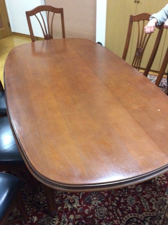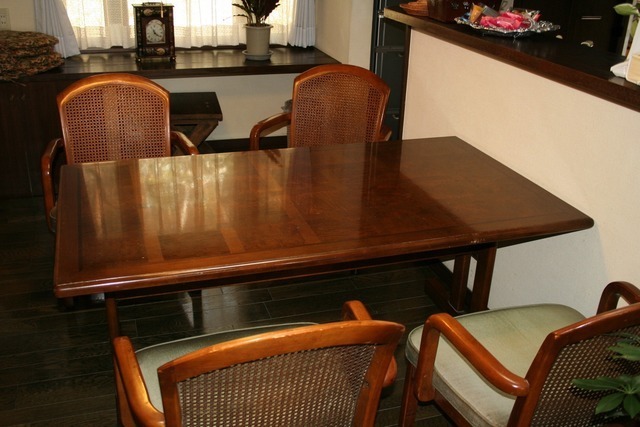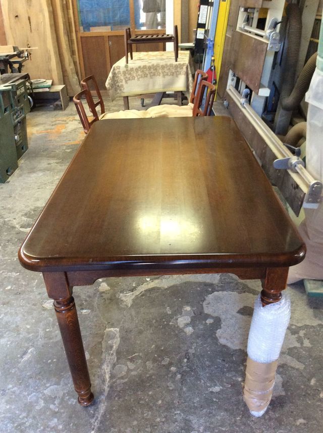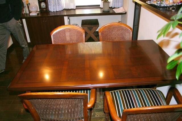 伸長式テーブル再塗装と椅子の張替えのご相談でした。お話を聞いてみると国産家具で長年使われた伸長テ-ブルを伸ばした状態で固定してお使いになるご希望です。イスは張替えです。