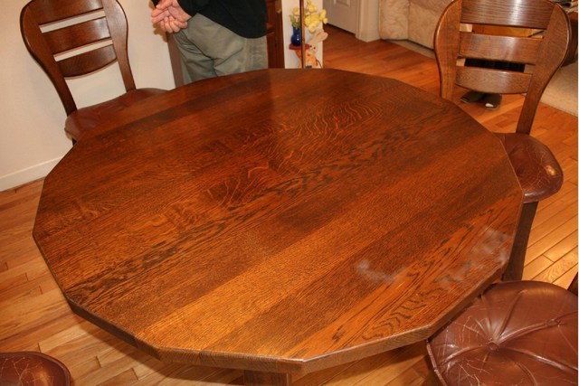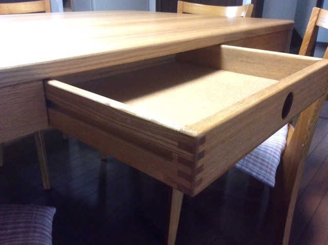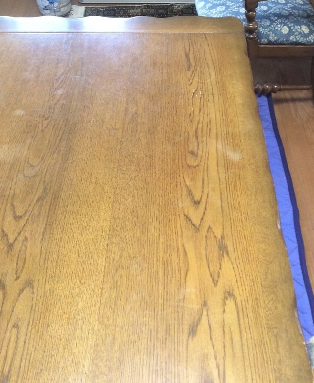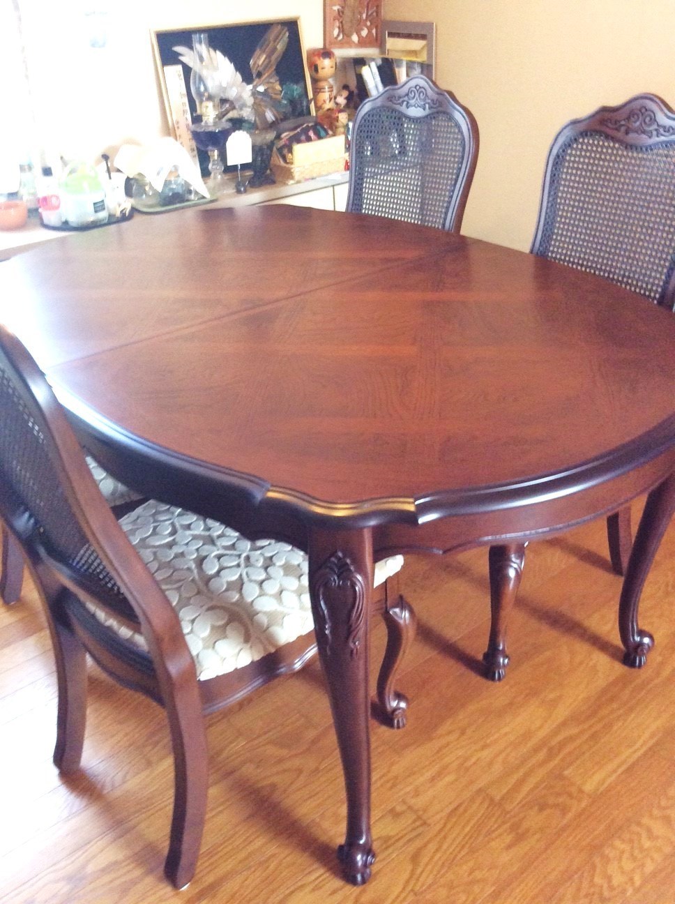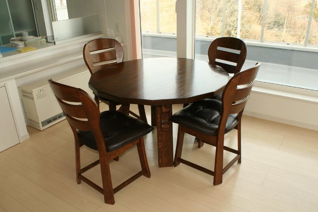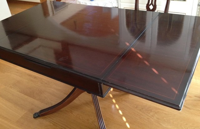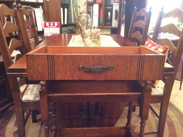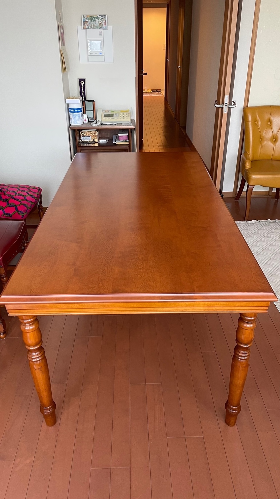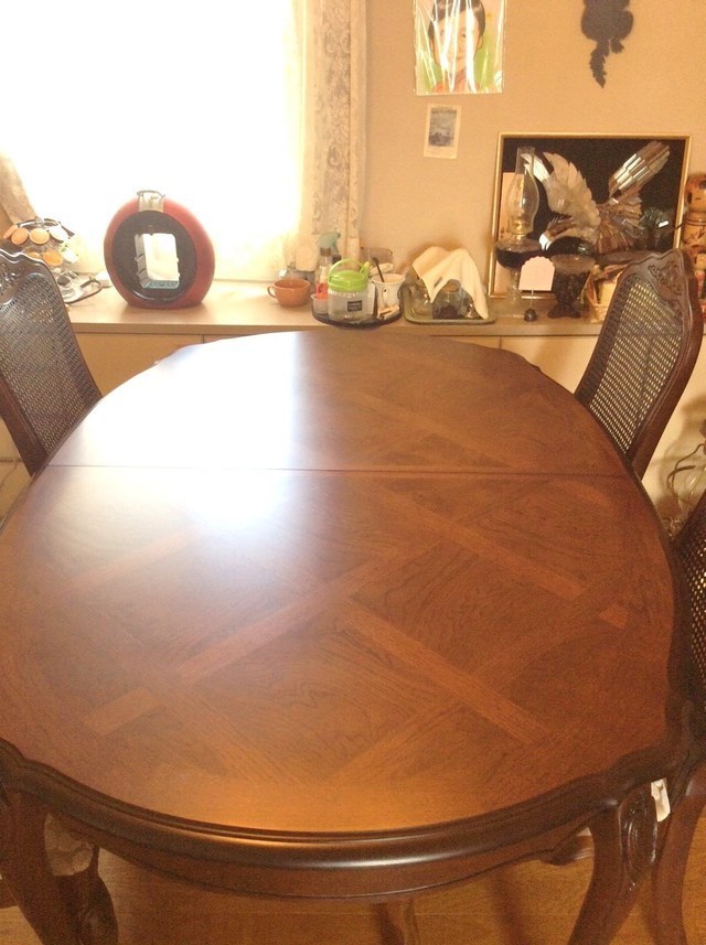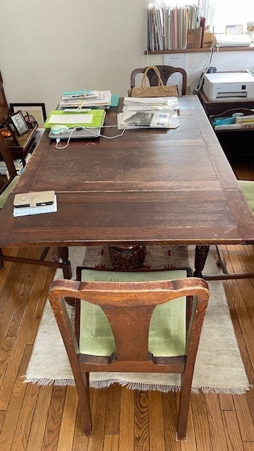伸長式テーブル再塗装と椅子の張替えのご相談でした。お話を聞いてみると国産家具で長年使われた伸長テ-ブルを伸ばした状態で固定してお使いになるご希望です。イスは張替えです。