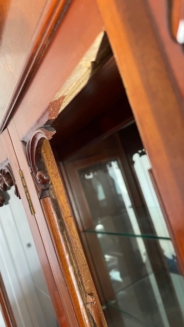 平成23年3月11日の地震で破損したベルギー製キャビネットです。上部が倒れて天井部分や飾りがバラバラに壊れた状態でした。お客様の思い出がたくさん詰まった家具でどうしても直したいと言うお話を聞いてどうにか直す方向で考えお引き受けしました。
