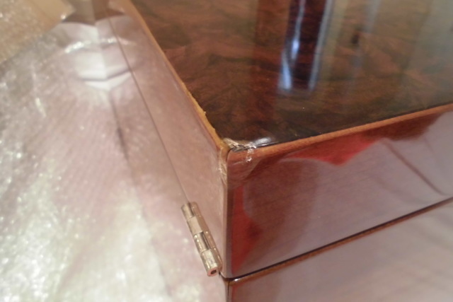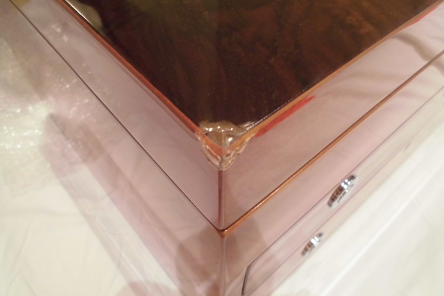 輸入品が運送途中で2ヶ所破損しました。どこに頼んでも断れ、インターネットで探し問い合わせても出来ないと言われ続けたようです。光沢のある鏡面仕上げで2カ所の角がつぶれているのは難し修理です。